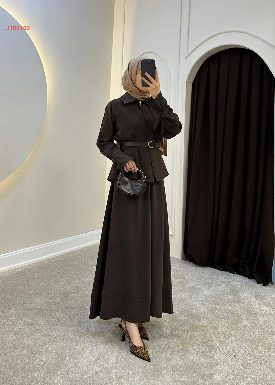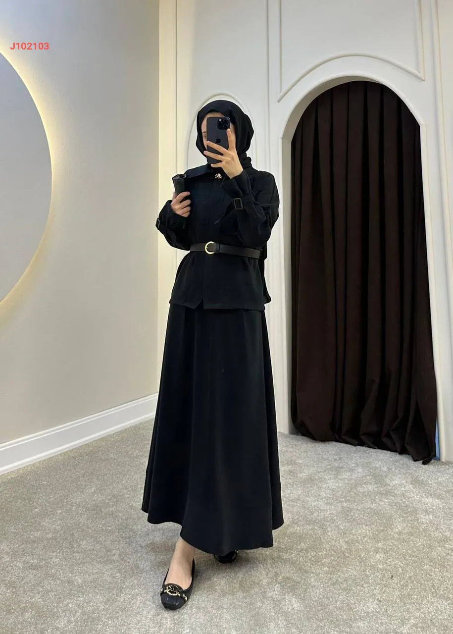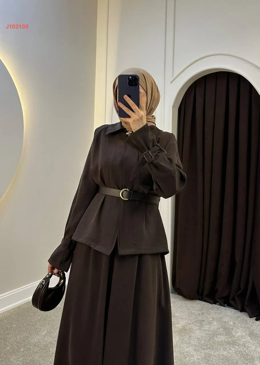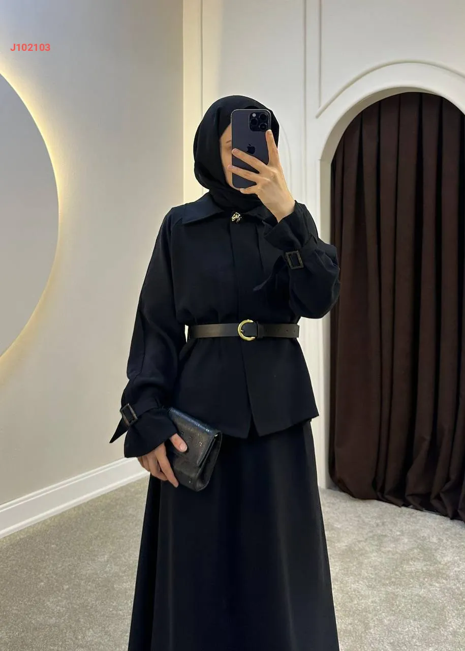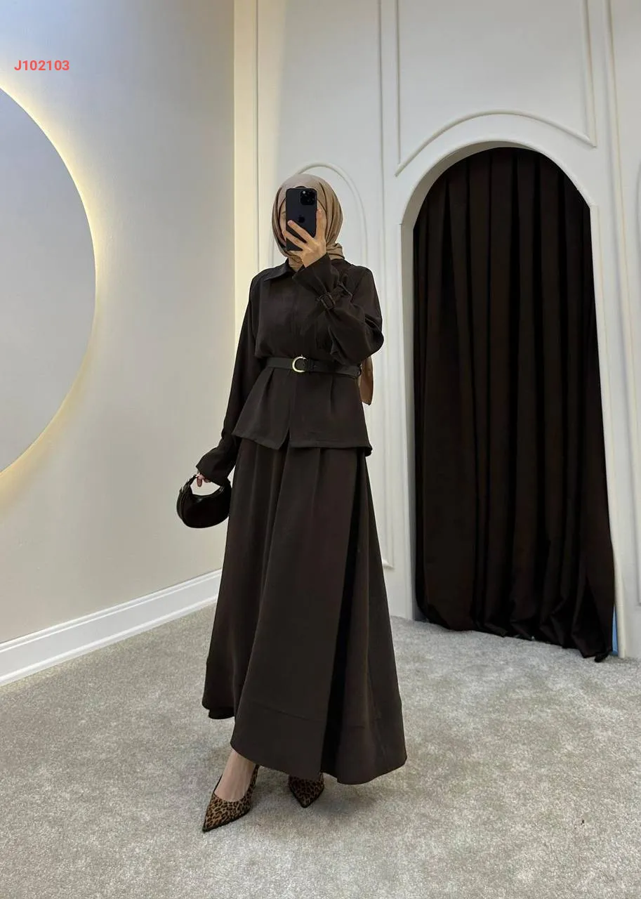 طقم تنورة قطعتين سادة بأزرار مع حزام