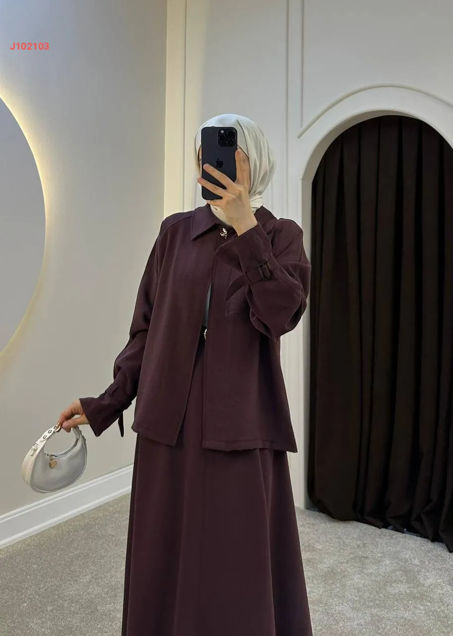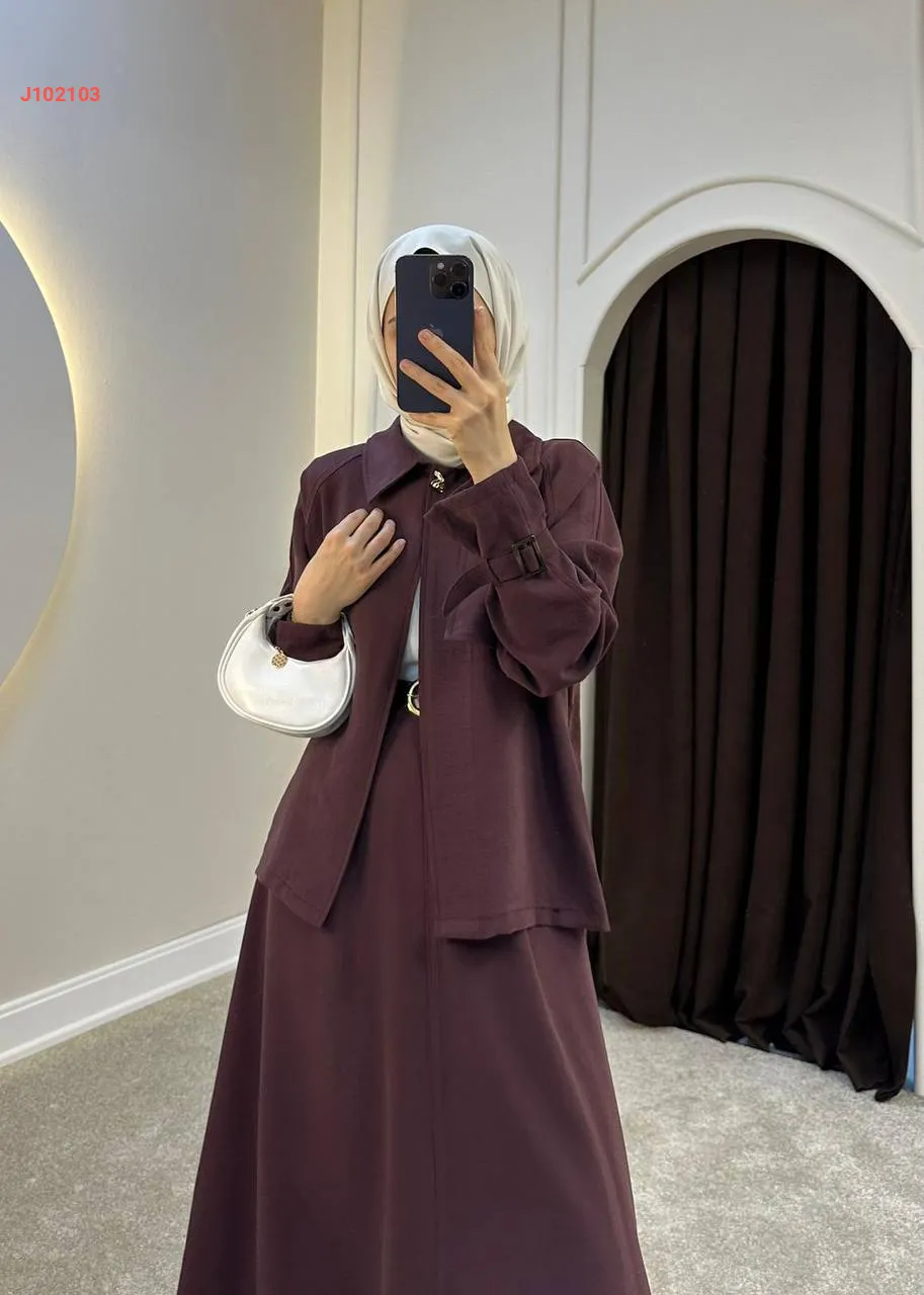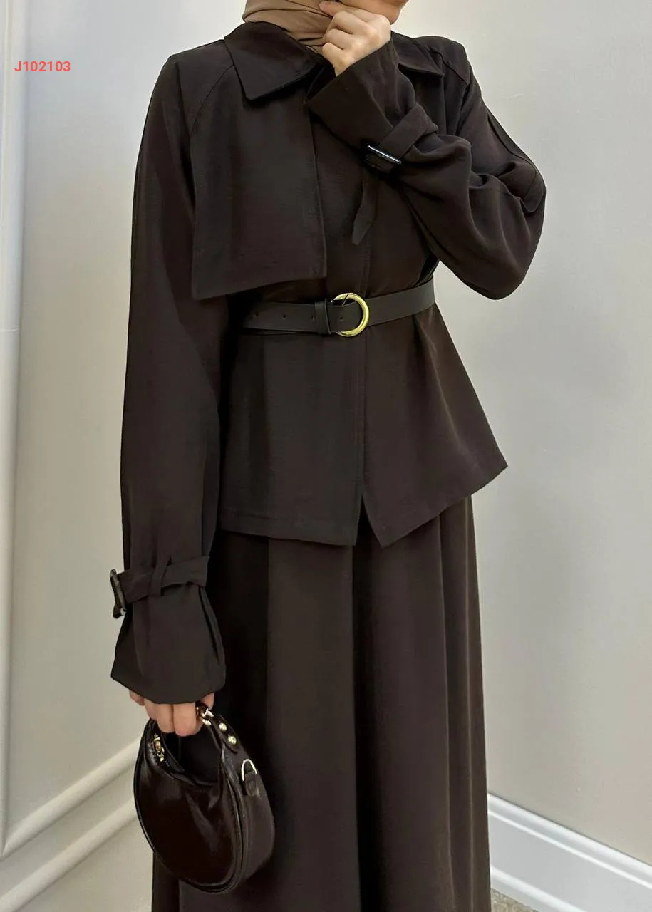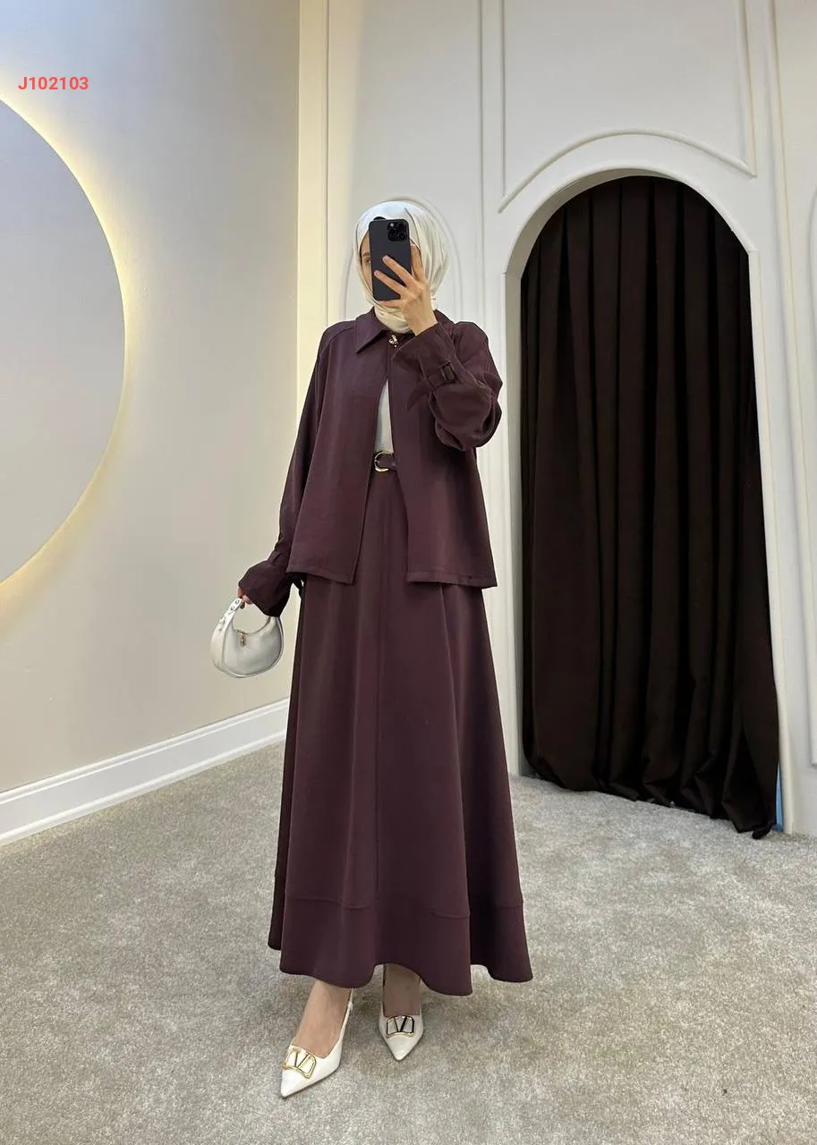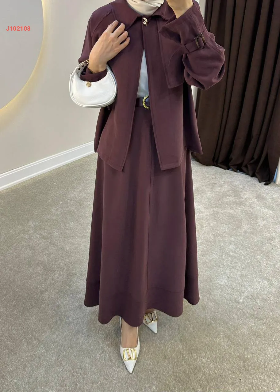 طقم تنورة قطعتين سادة بأزرار مع حزام
