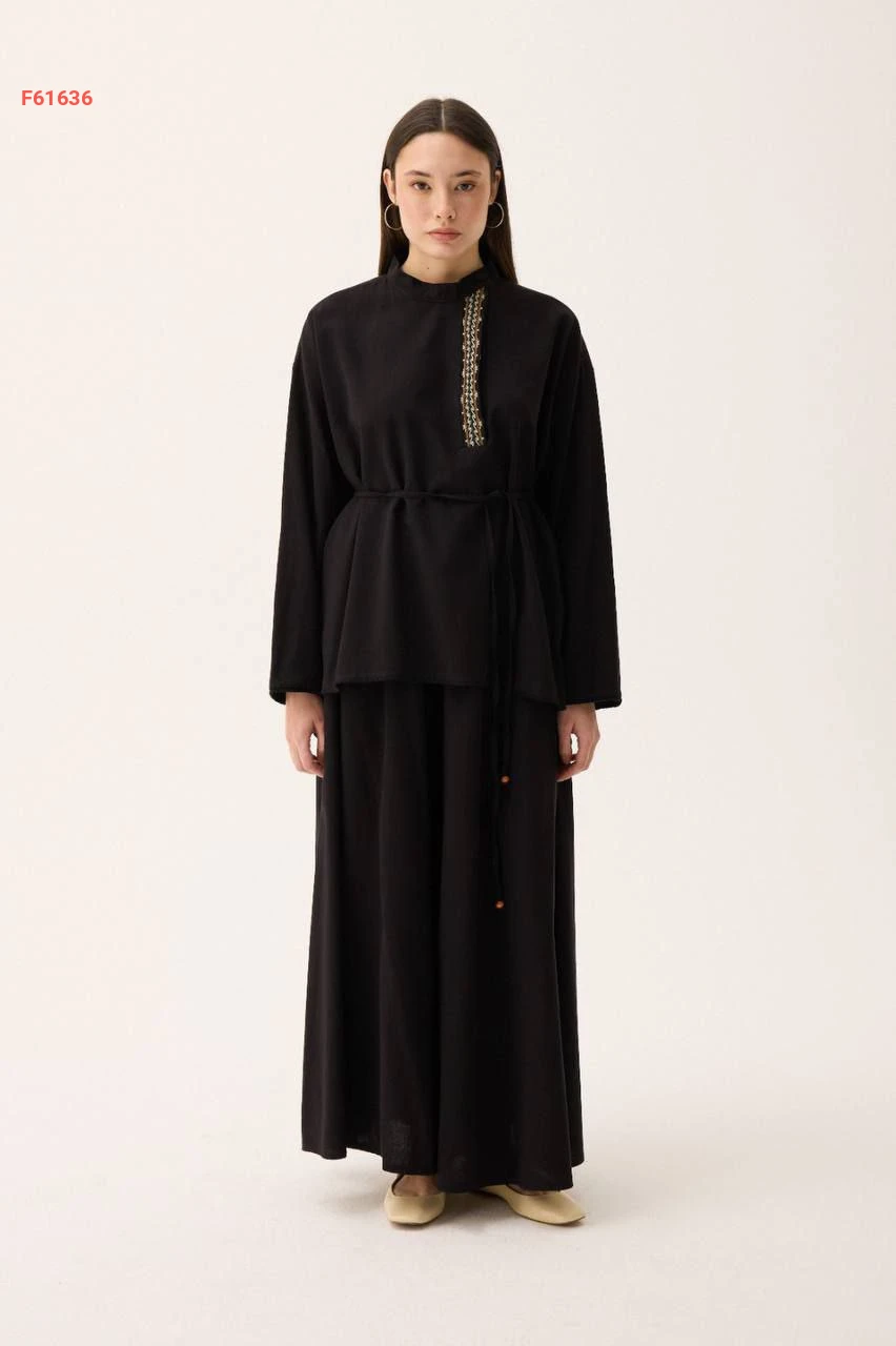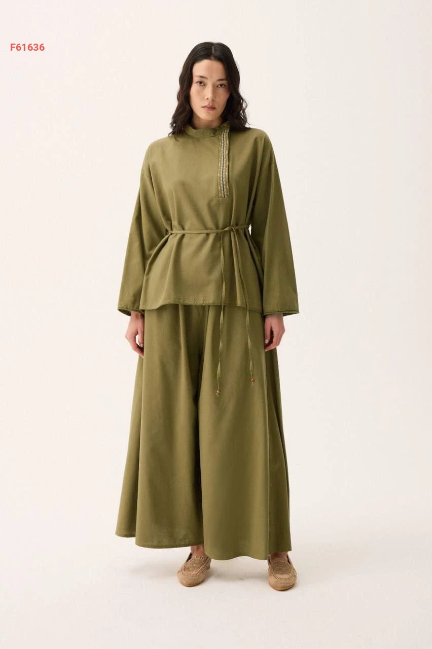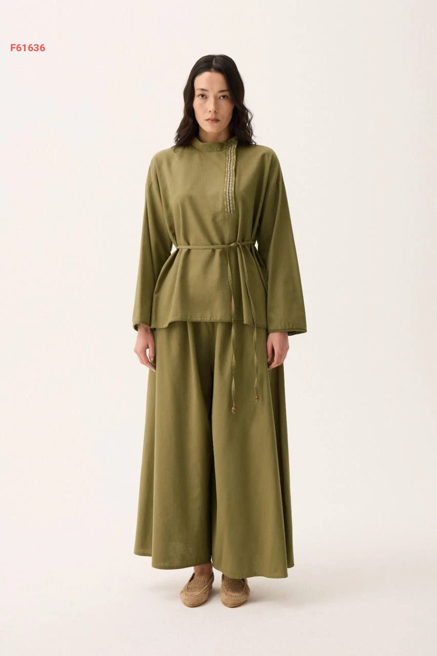 طقم بنطال قطعتين واسع بتطريز ناعم عند الصدر مع ربطة خصر