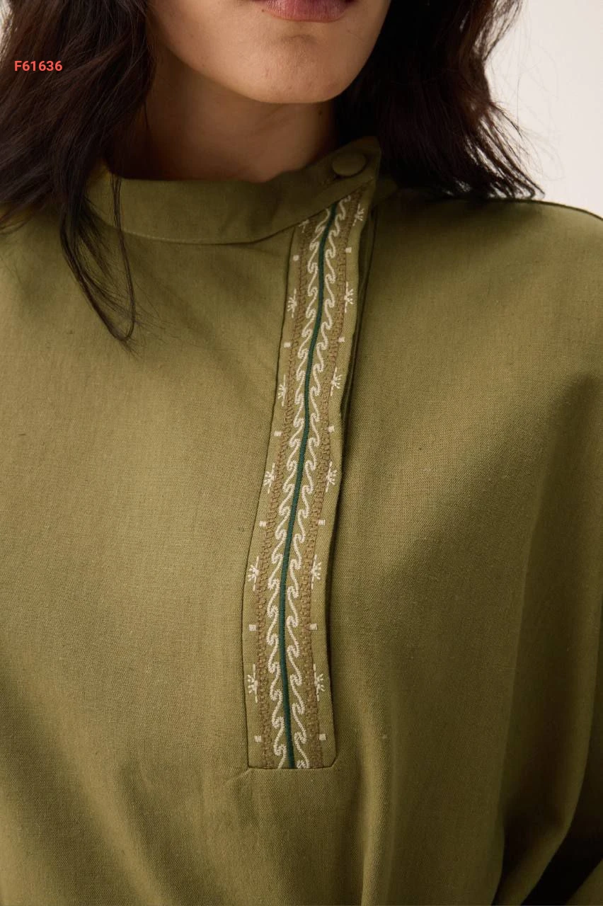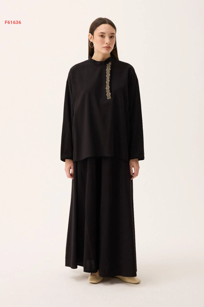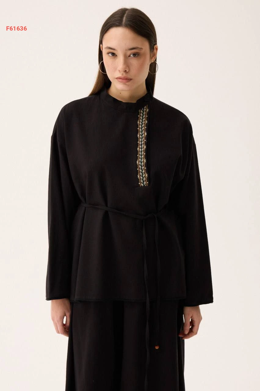 طقم بنطال قطعتين واسع بتطريز ناعم عند الصدر مع ربطة خصر