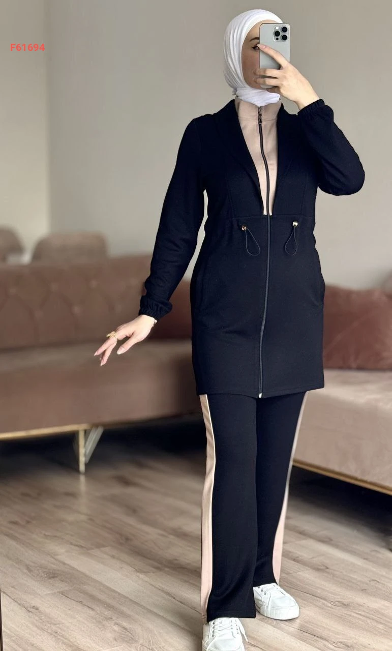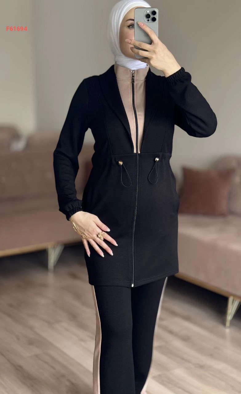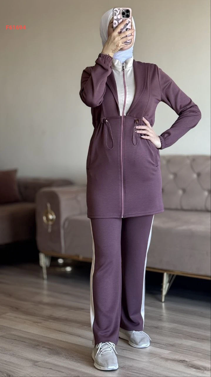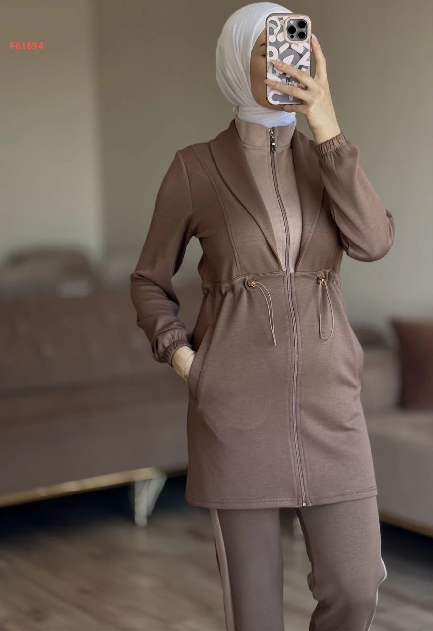 بيجامة قطعتين بسحاب مع زمة خصر وجيب