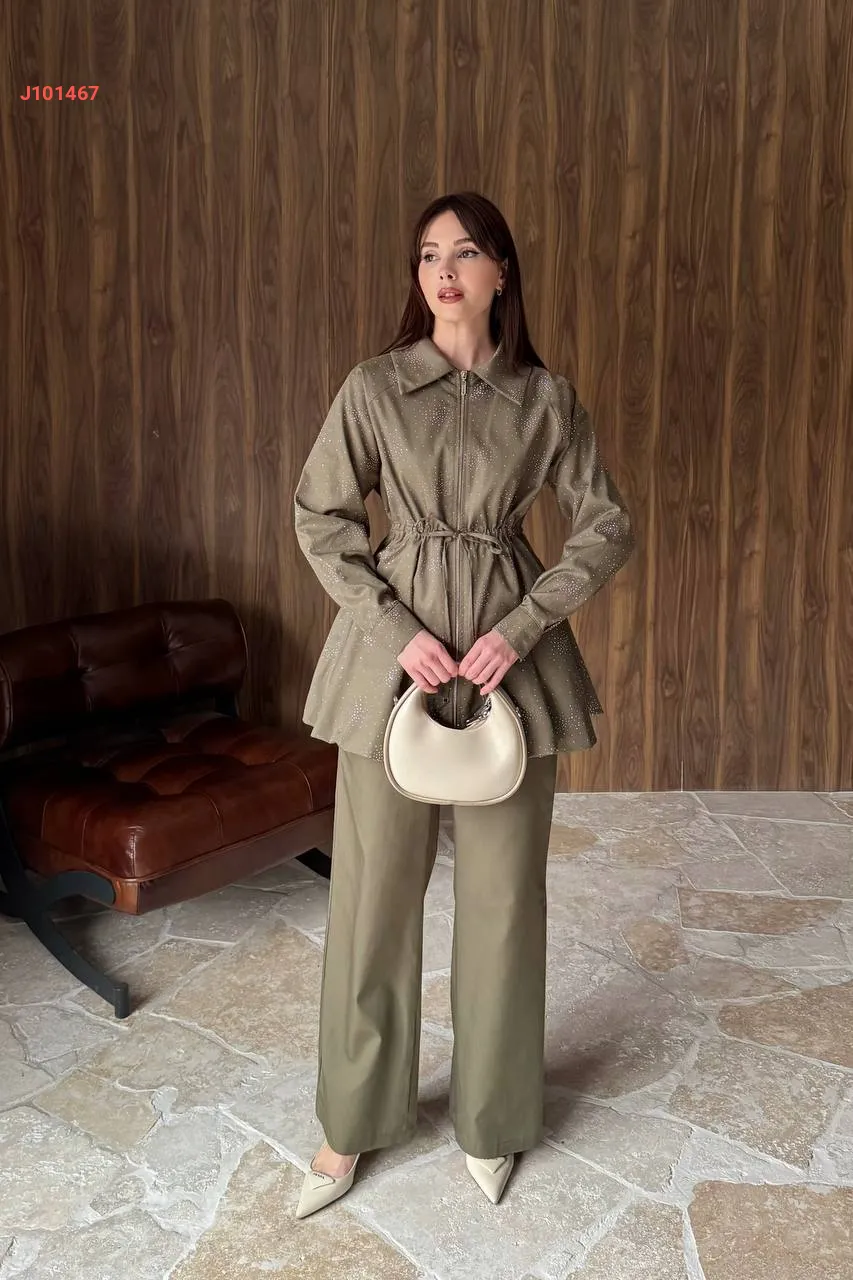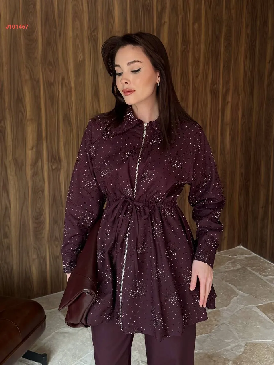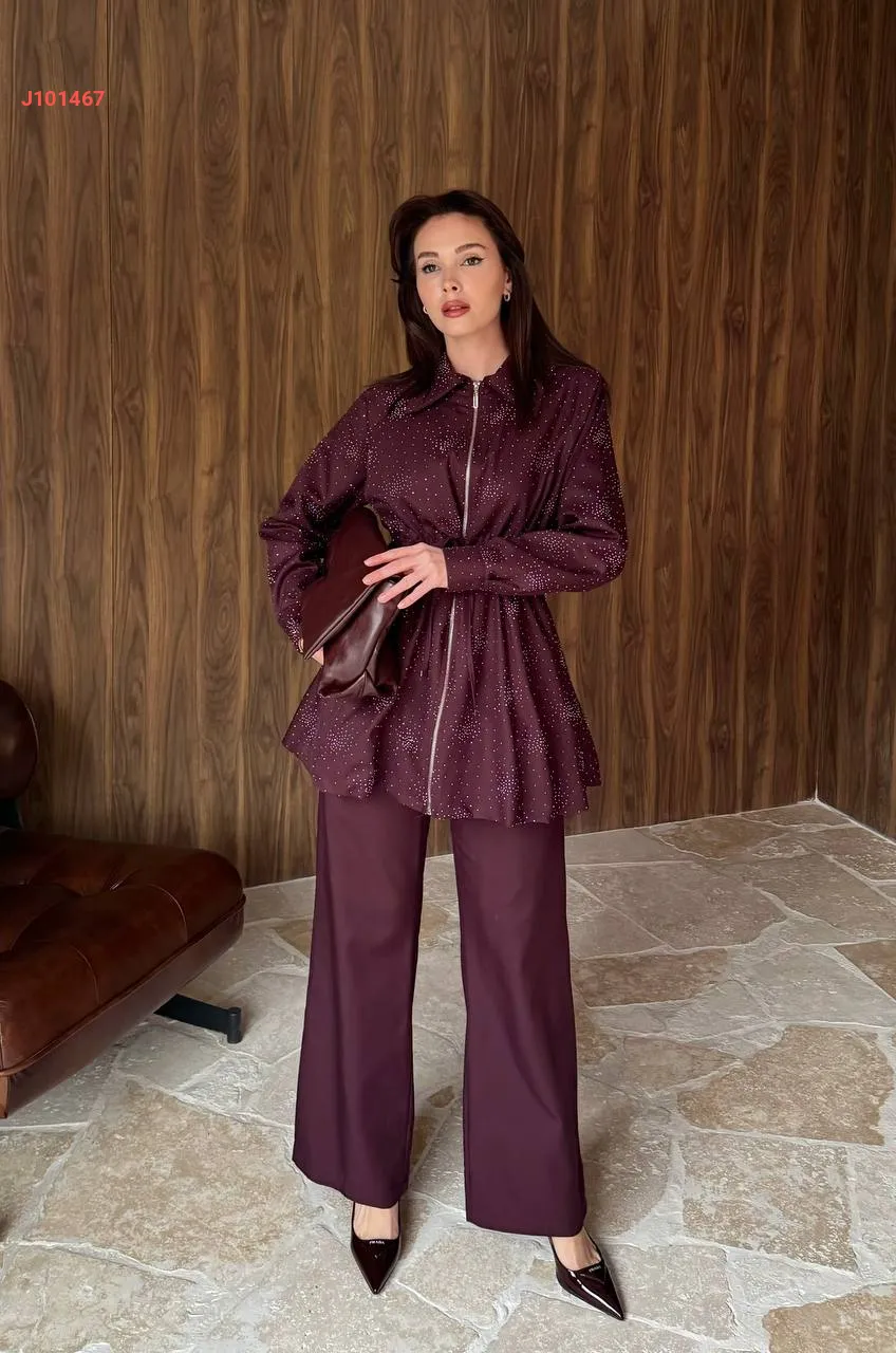 طقم قطعتين بسحاب، بزمة خصر ، مزين بالاستراس