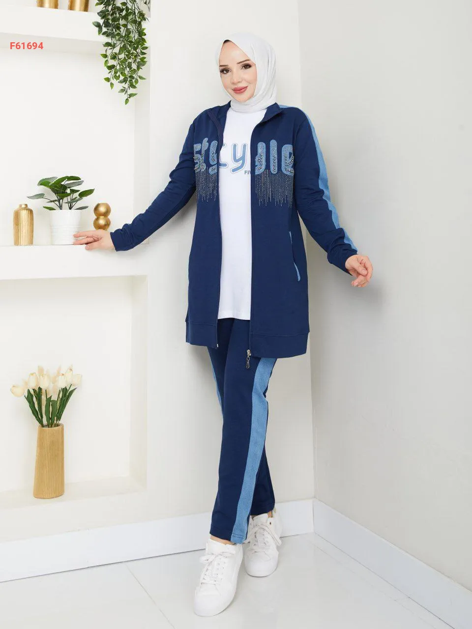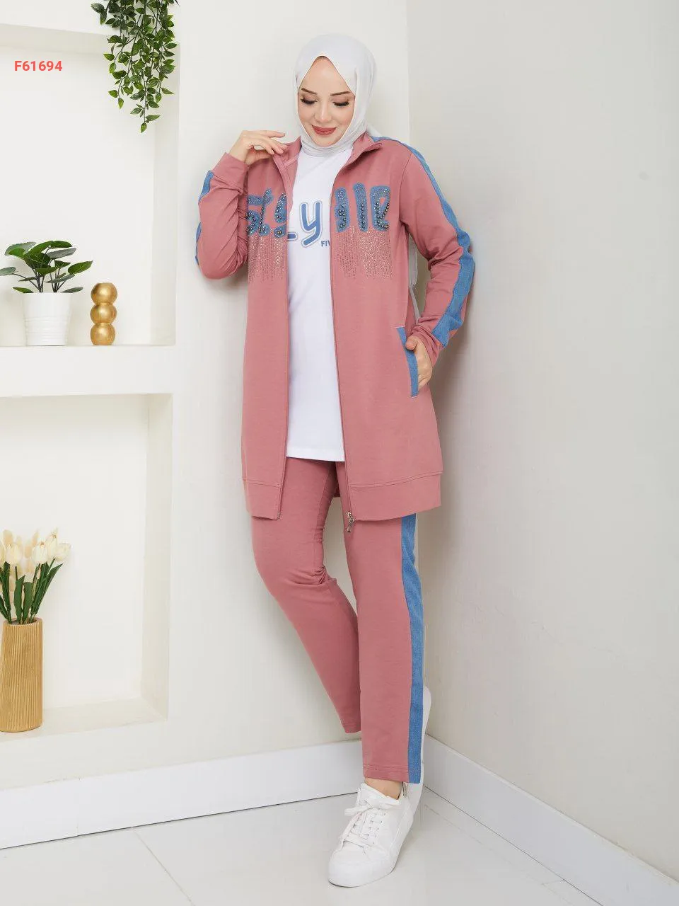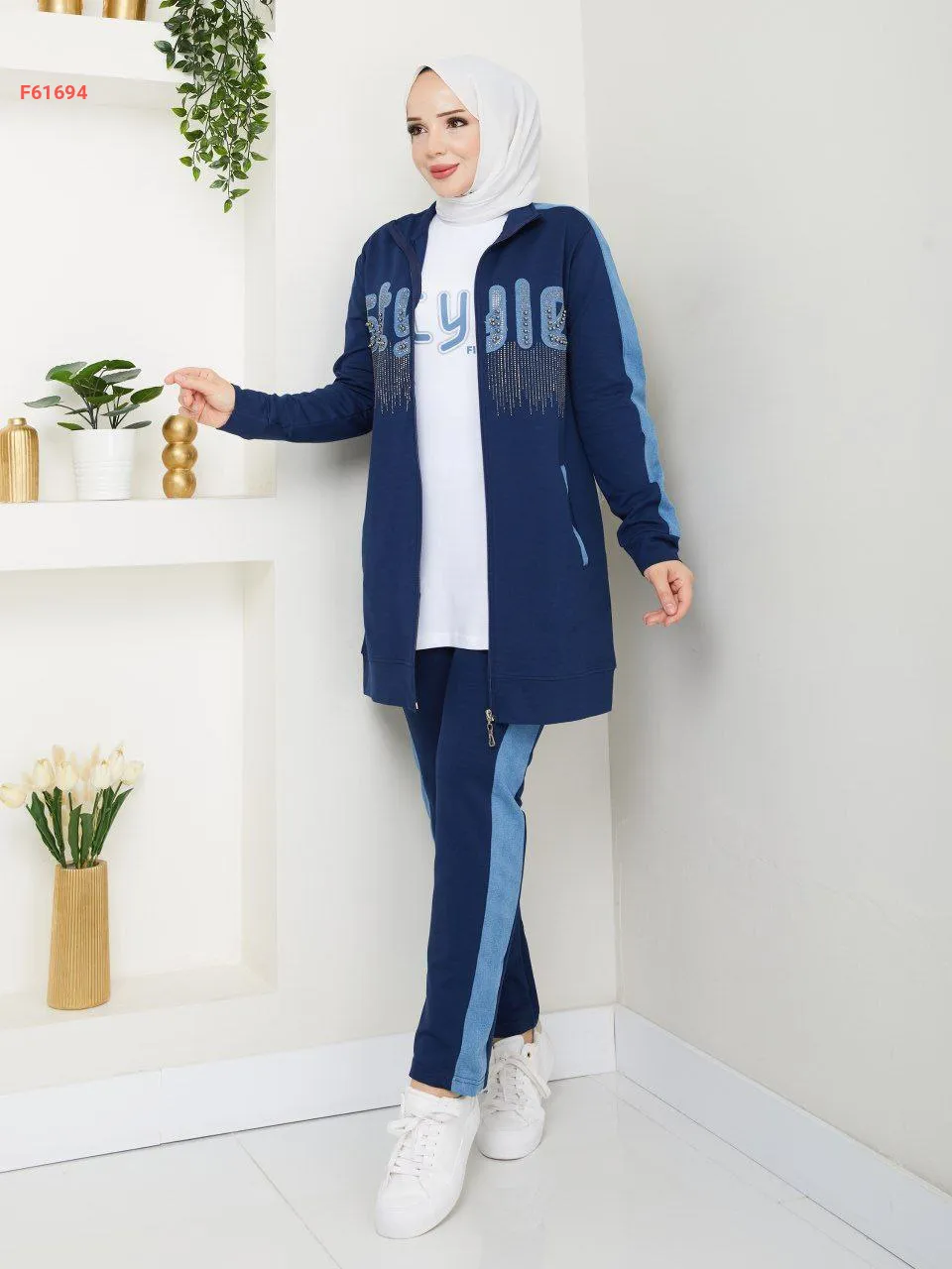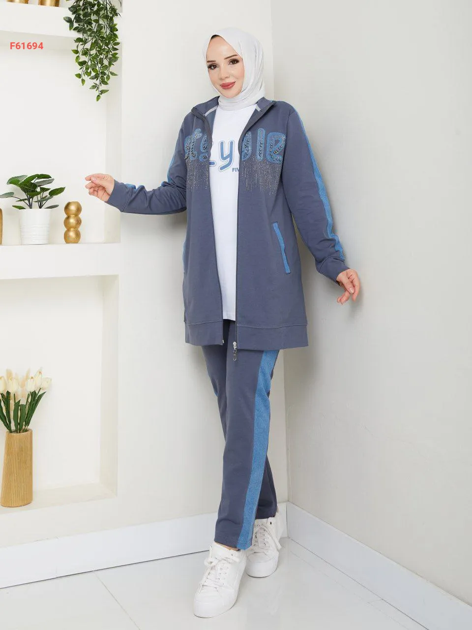 بيجامة 3 قطع بسحاب، مع خطوط جينز من الجانب ، مع استرس عند الصدر