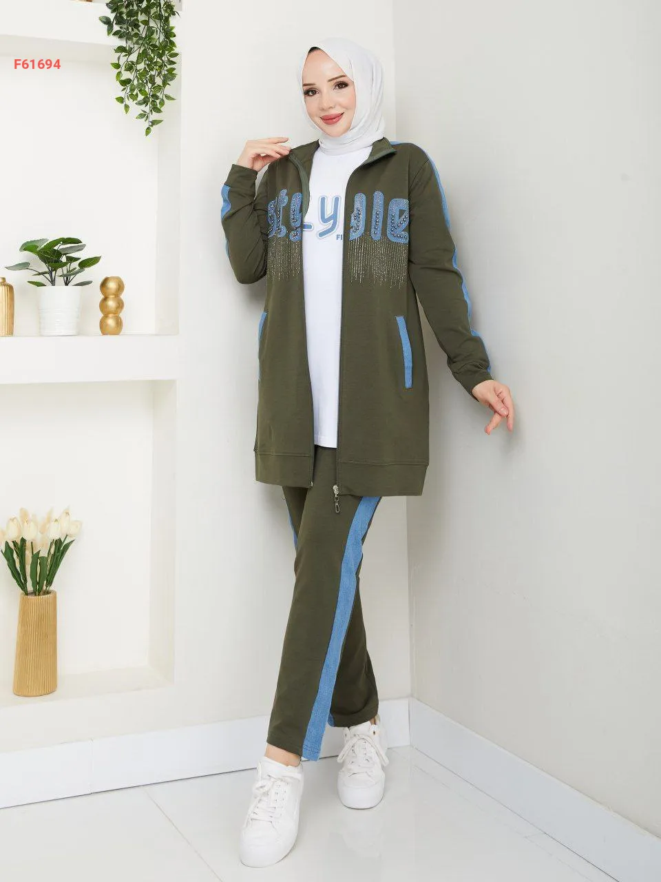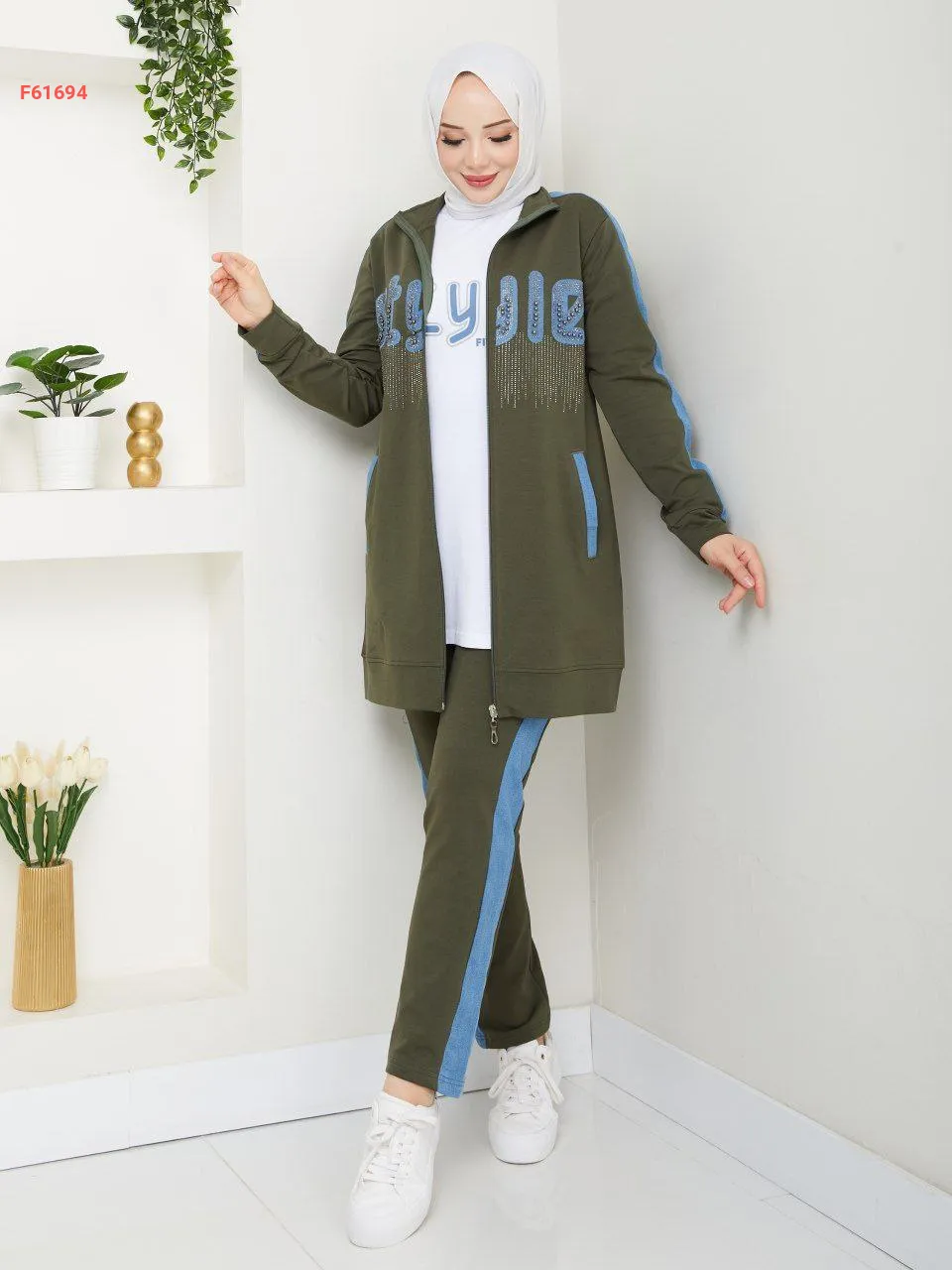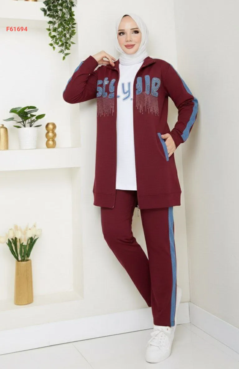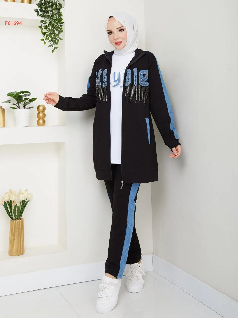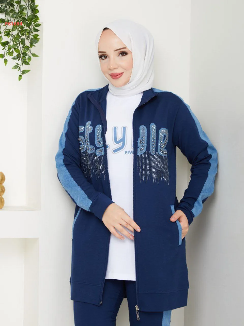 بيجامة 3 قطع بسحاب، مع خطوط جينز من الجانب ، مع استرس عند الصدر