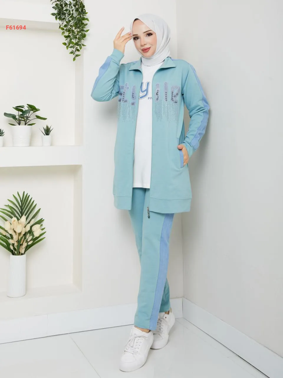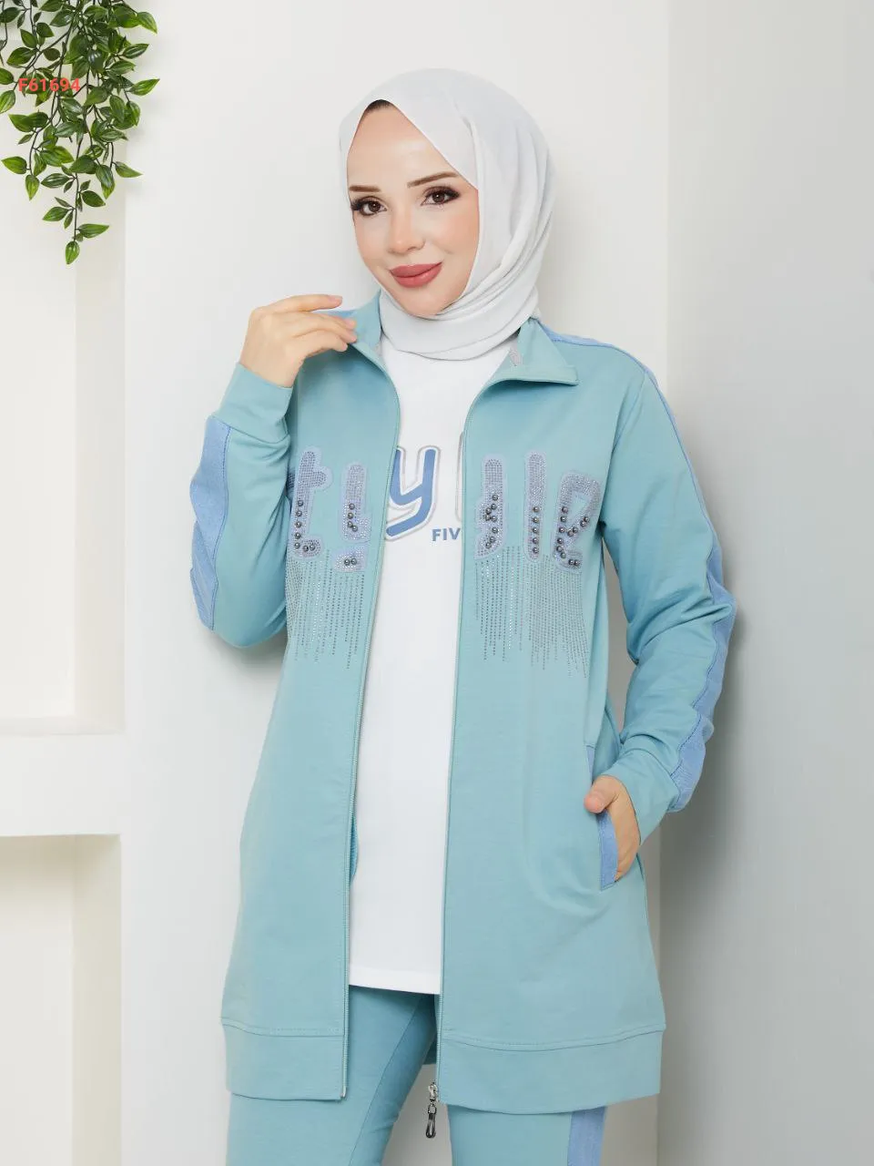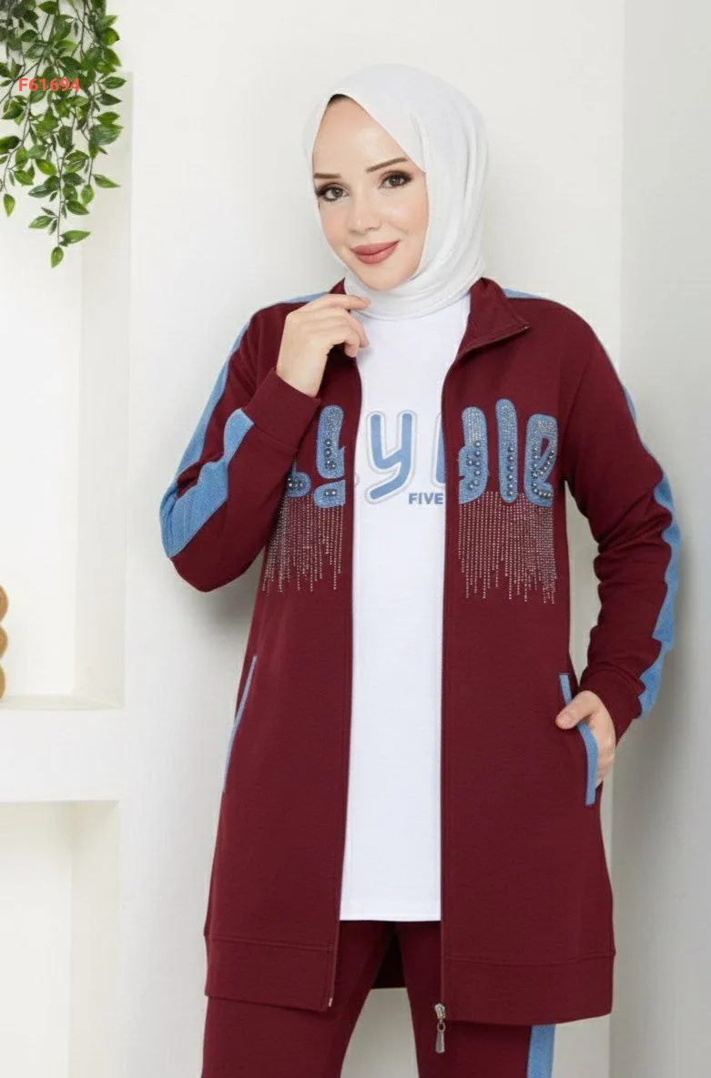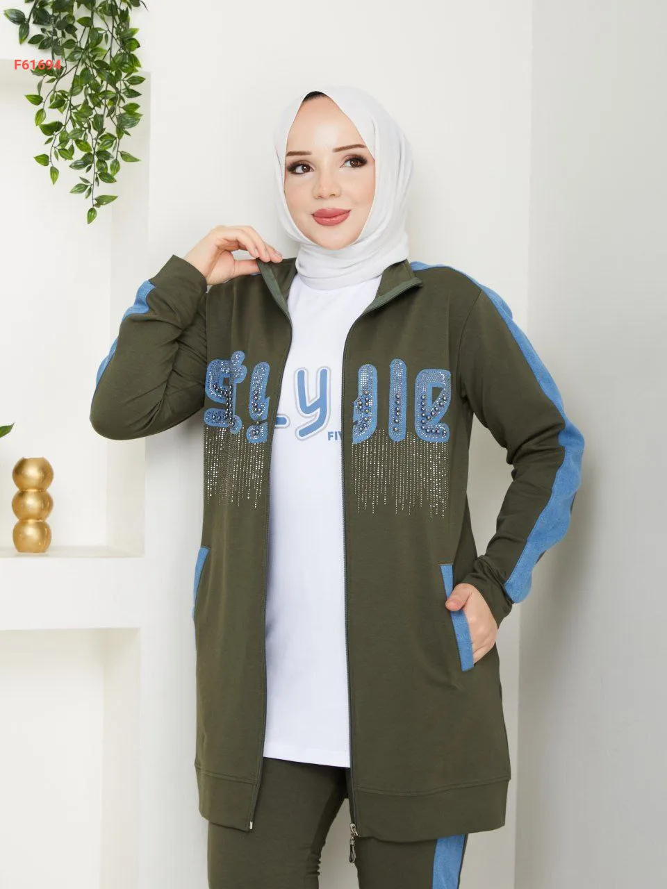 بيجامة 3 قطع بسحاب، مع خطوط جينز من الجانب ، مع استرس عند الصدر
