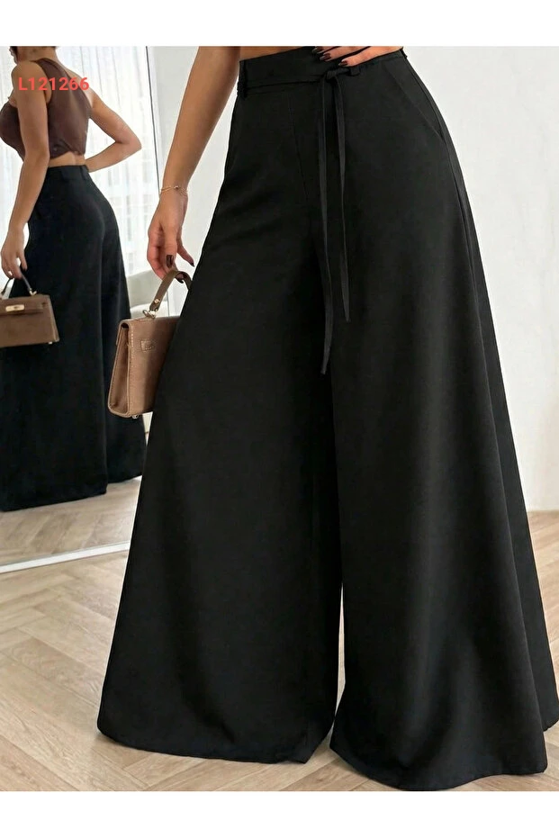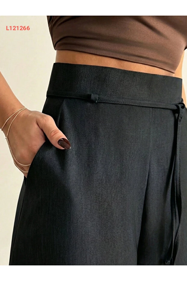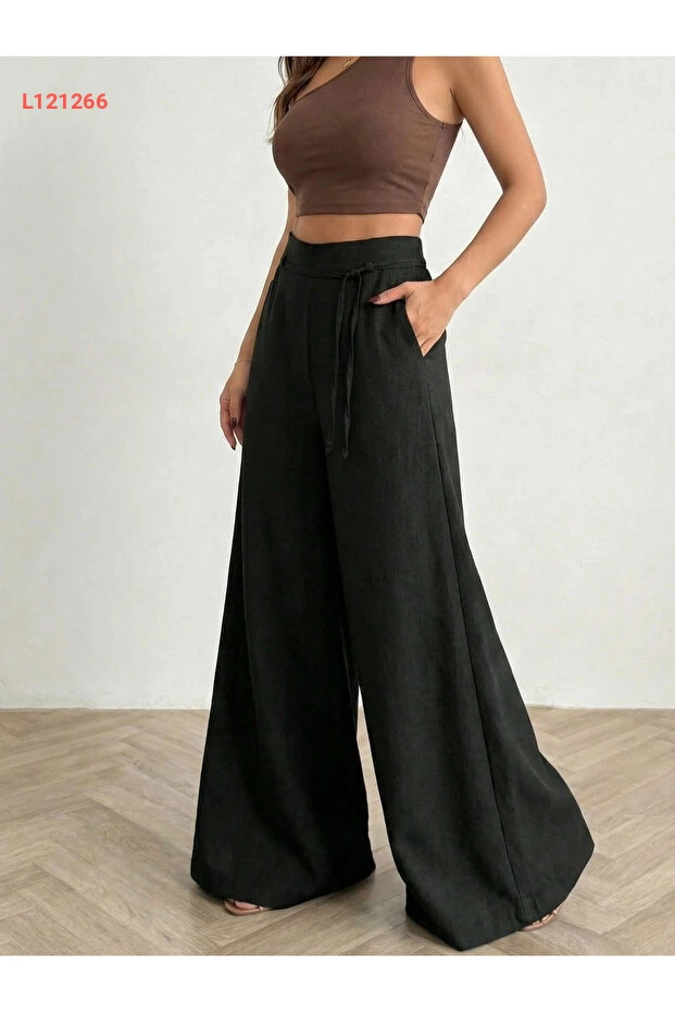 بنطلون سومنيا النسائي الأسود القابل للتعديل بخصر عالٍ وقصة واسعة من الكتان