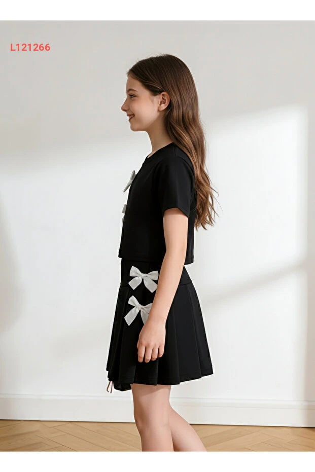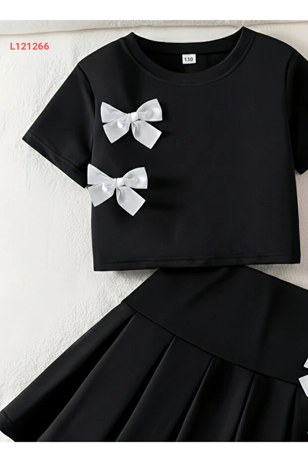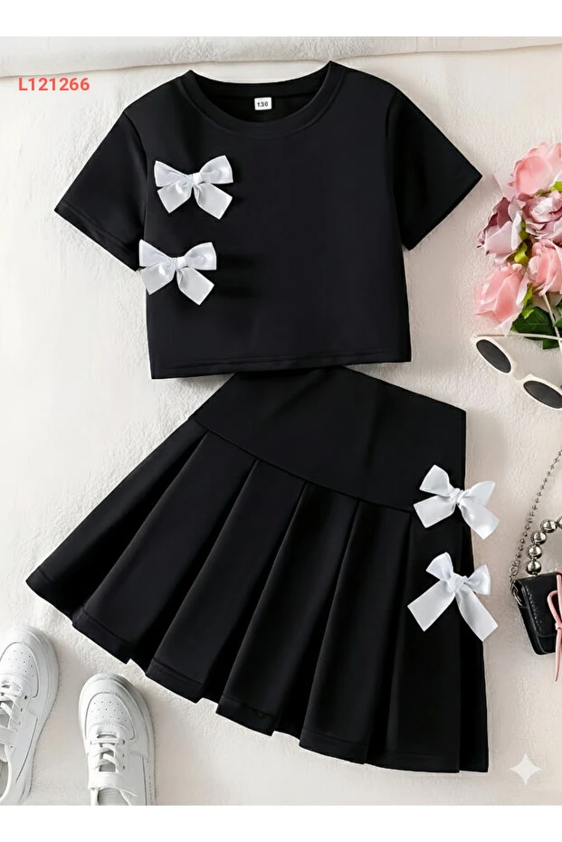 طقم تيشيرت وتنورة متوسطة الفتحة مع تفاصيل فراشة للبنات (من 3 إلى 12 سنة)