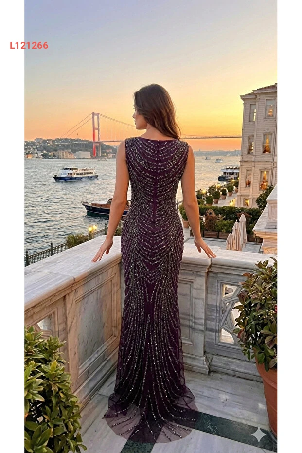 فستان سهرة فاخر مزين بالكريستال والباييت مع تصميم ضاغط للجسم