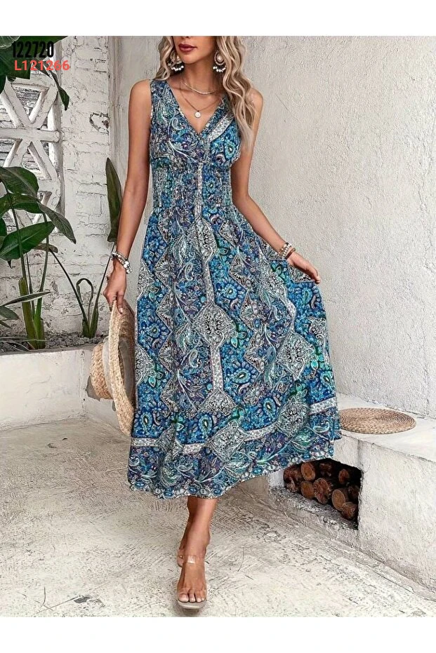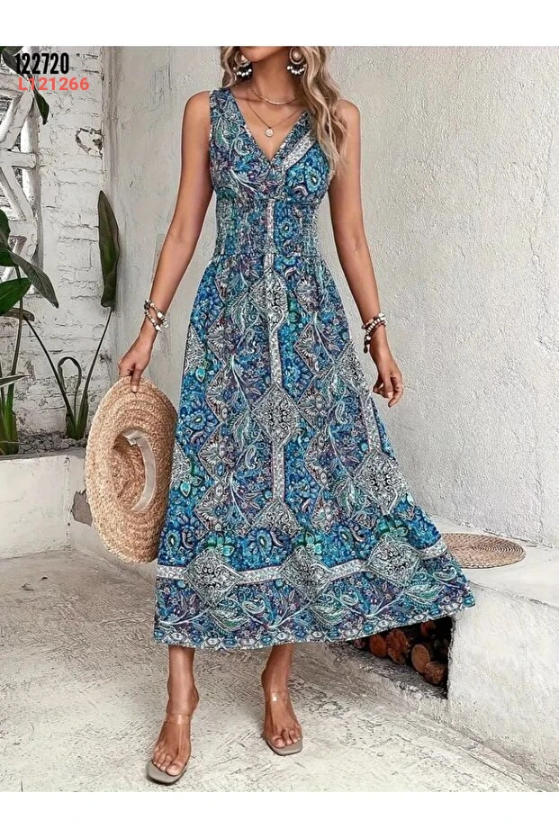 Valeria Butik Kadın Bohem Desenli V Yaka Kolsuz Midi Elbise – Yazlık Rahat Kesim