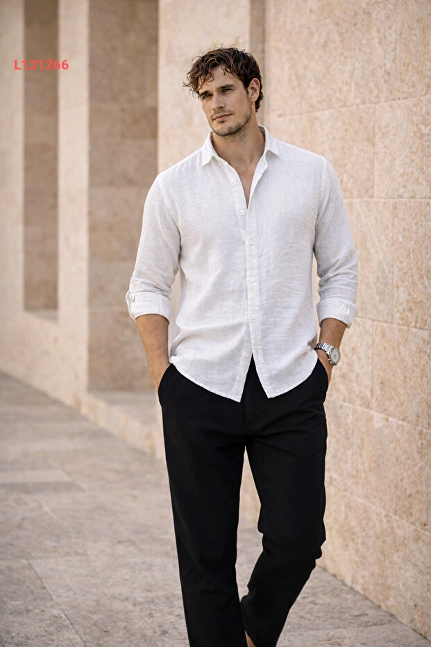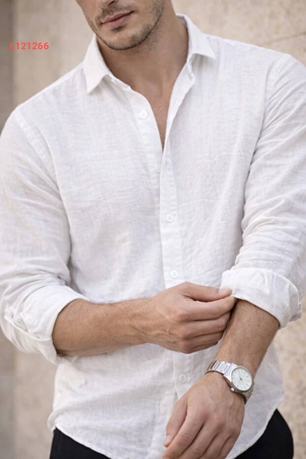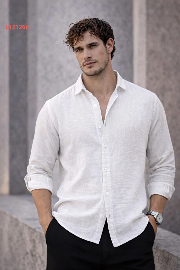 قميص رجال بيور من موسلين بأكمام طويلة ونمط فضفاض - أبيض
