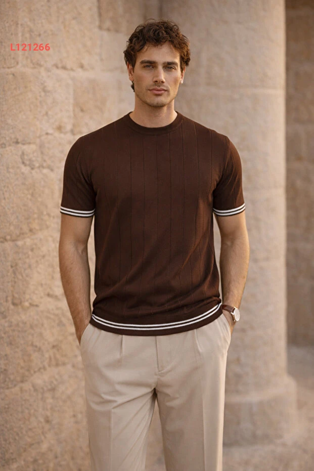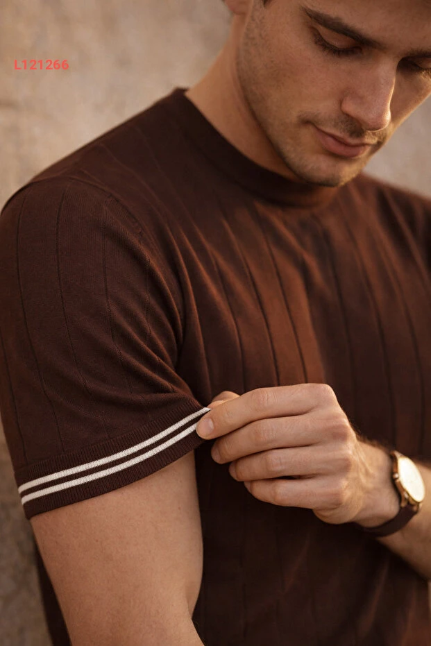 تي شيرت رجالي بقصة عادية بياقة دائرية وحواف مزخرفة - بني