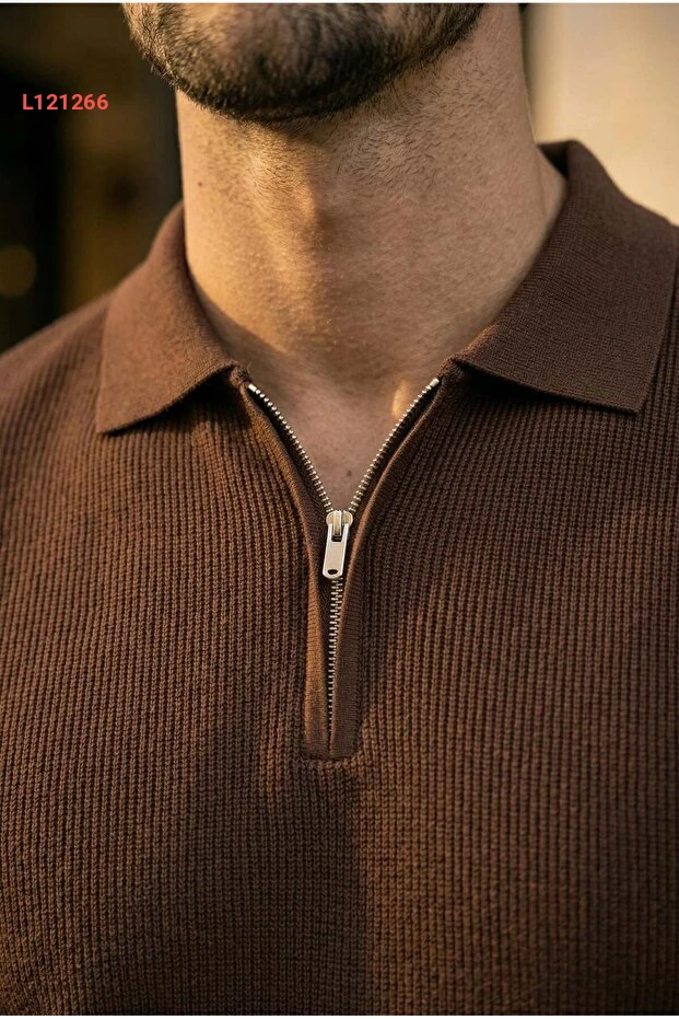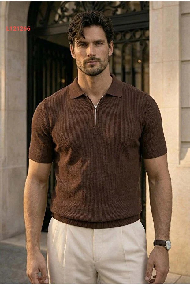 تي شيرت رجالي مقلّم بقصة بولوج والمزود بسحاب نصفي - لون بني