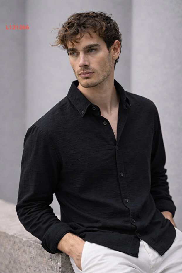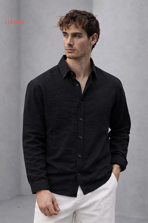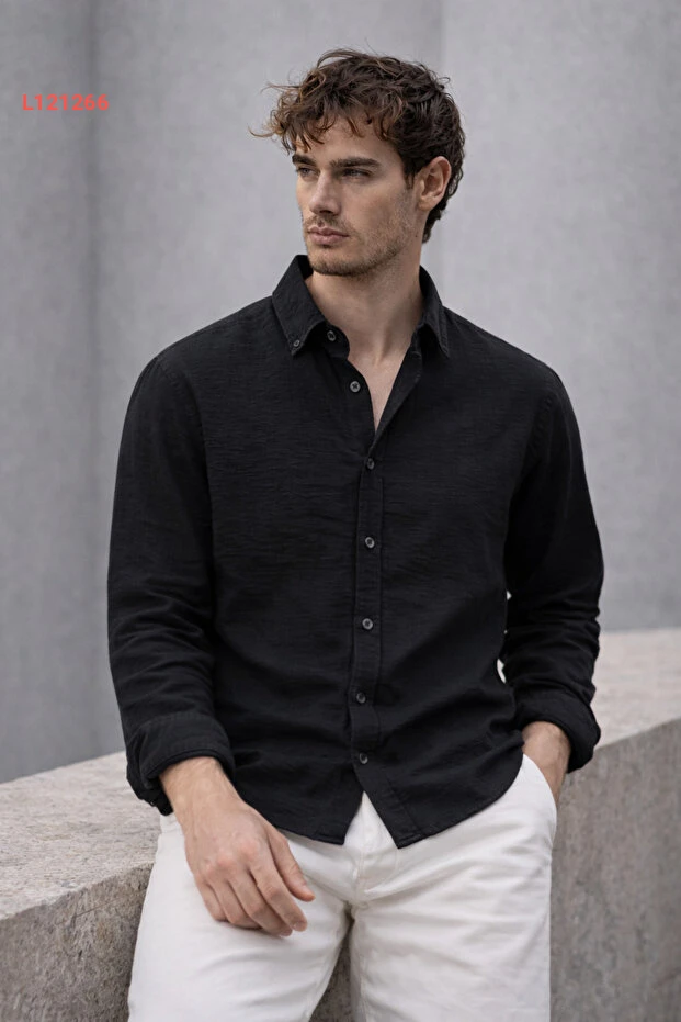 قميص فاليبيرتا الرجالي نصف واسع بأكمام طويلة بتصميم قماش الكتان - أسود