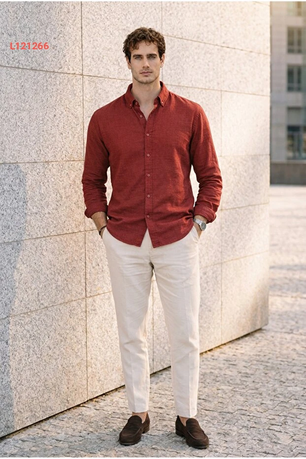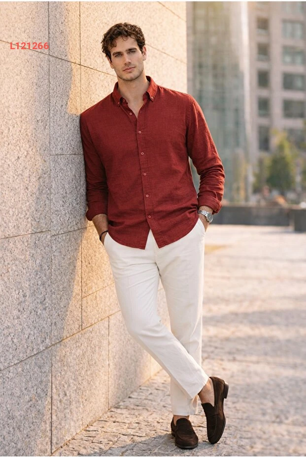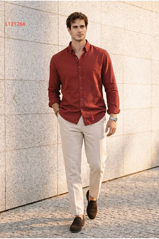 قميص رجالي بأكمام طويلة بتصميم واسع من قماش الكتان - لون قرمزي