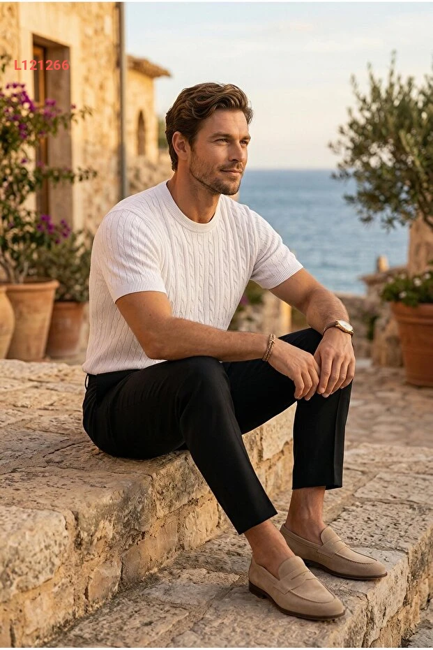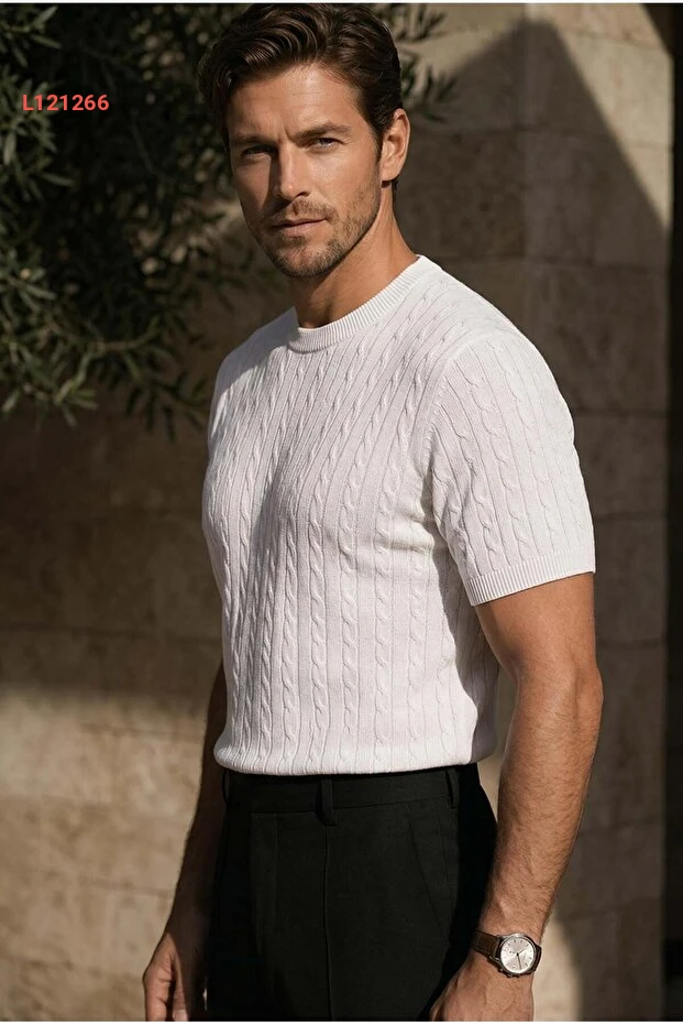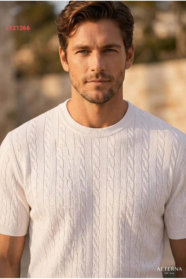 تي شيرت رجالي رقيق ضيق بياقة دائرية بتصميم جديلة من فالبيرتا والشفافة - إكروا
