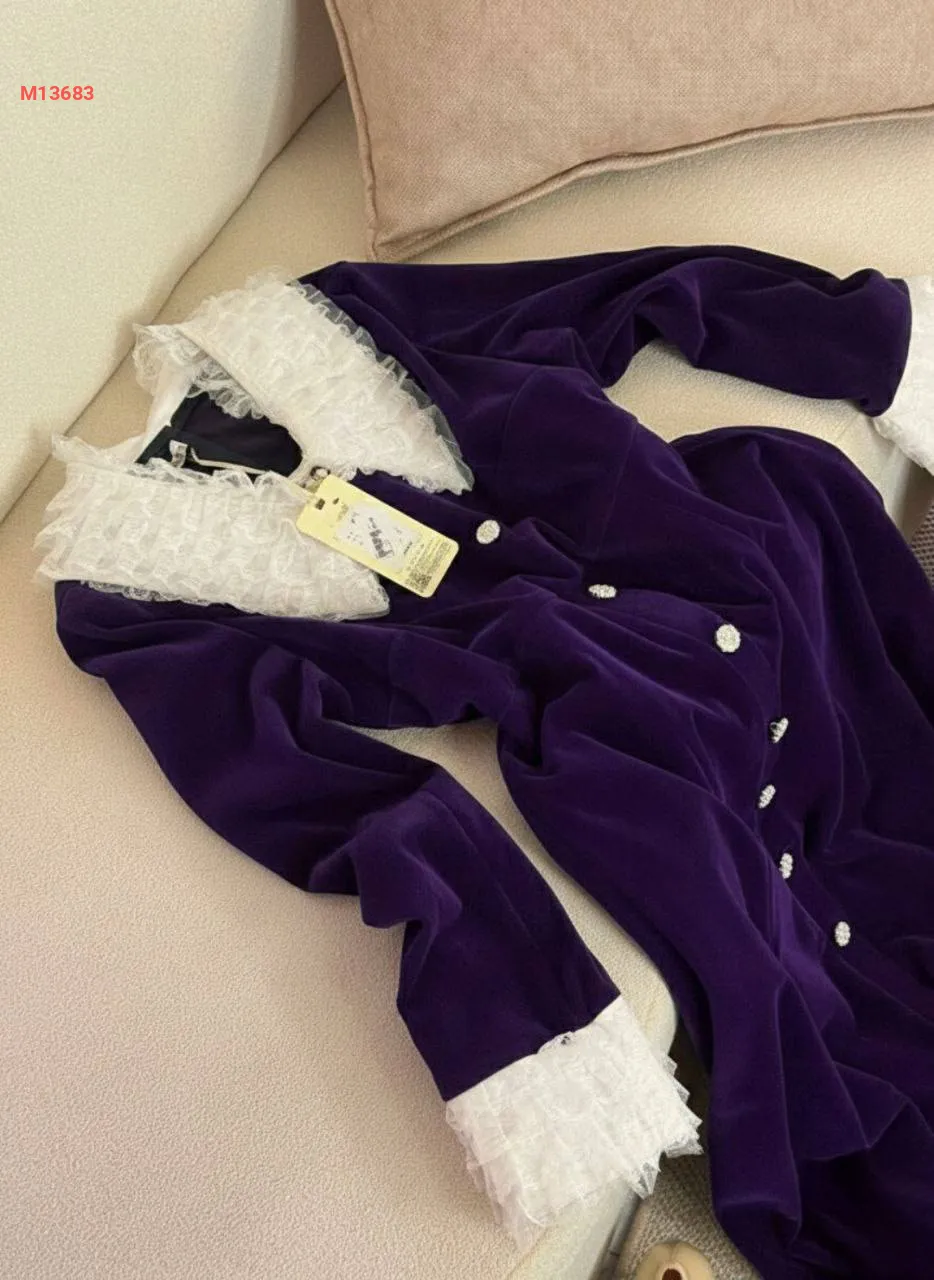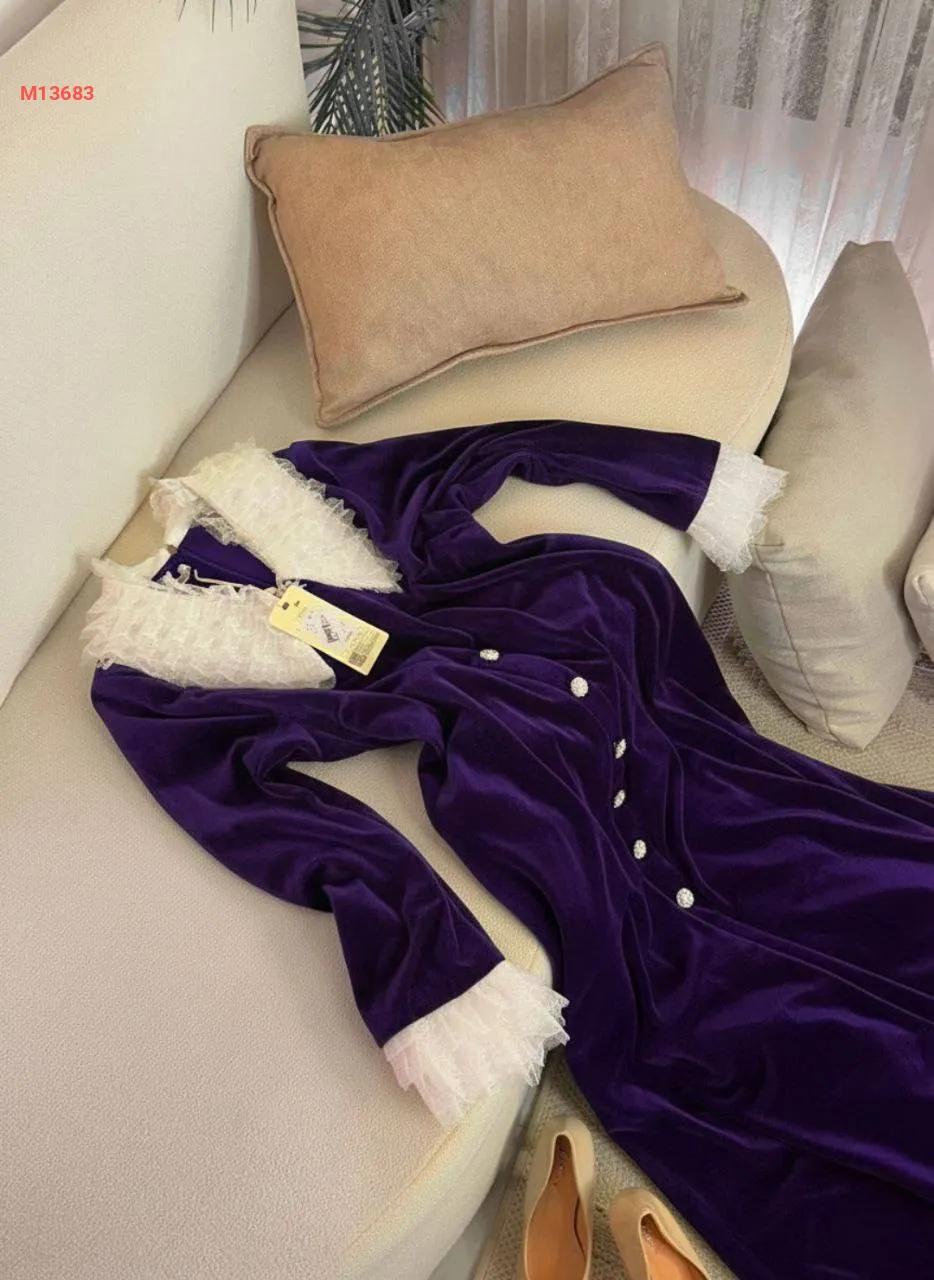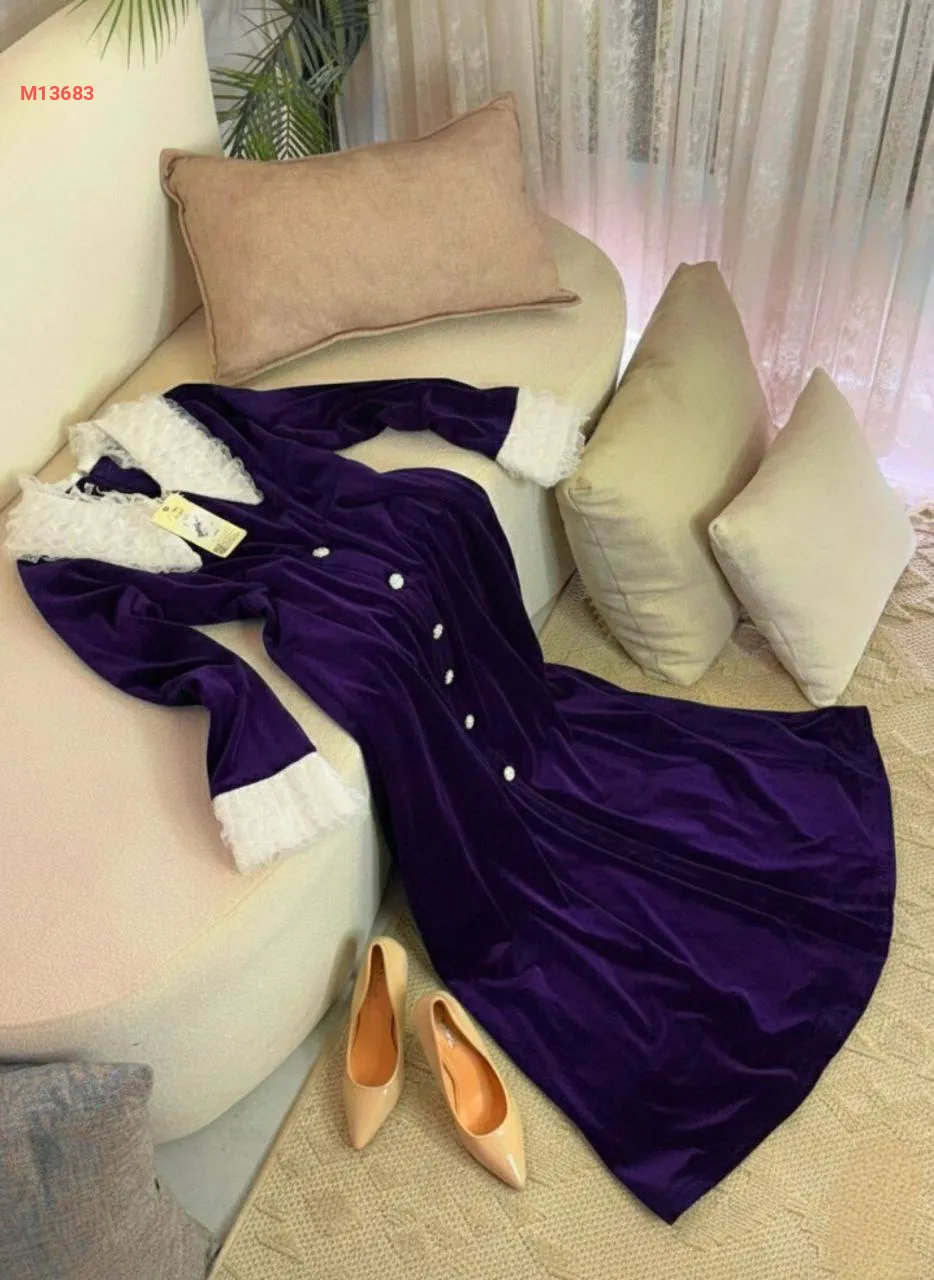 فستان مخمل سادة قبة دانتيل مع أكمام دانتيل،بأزرار