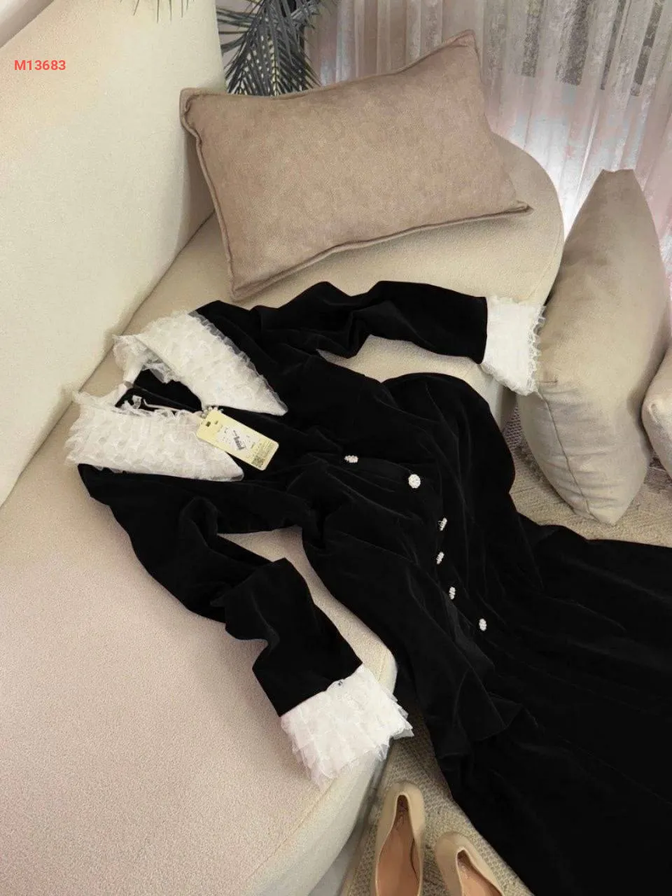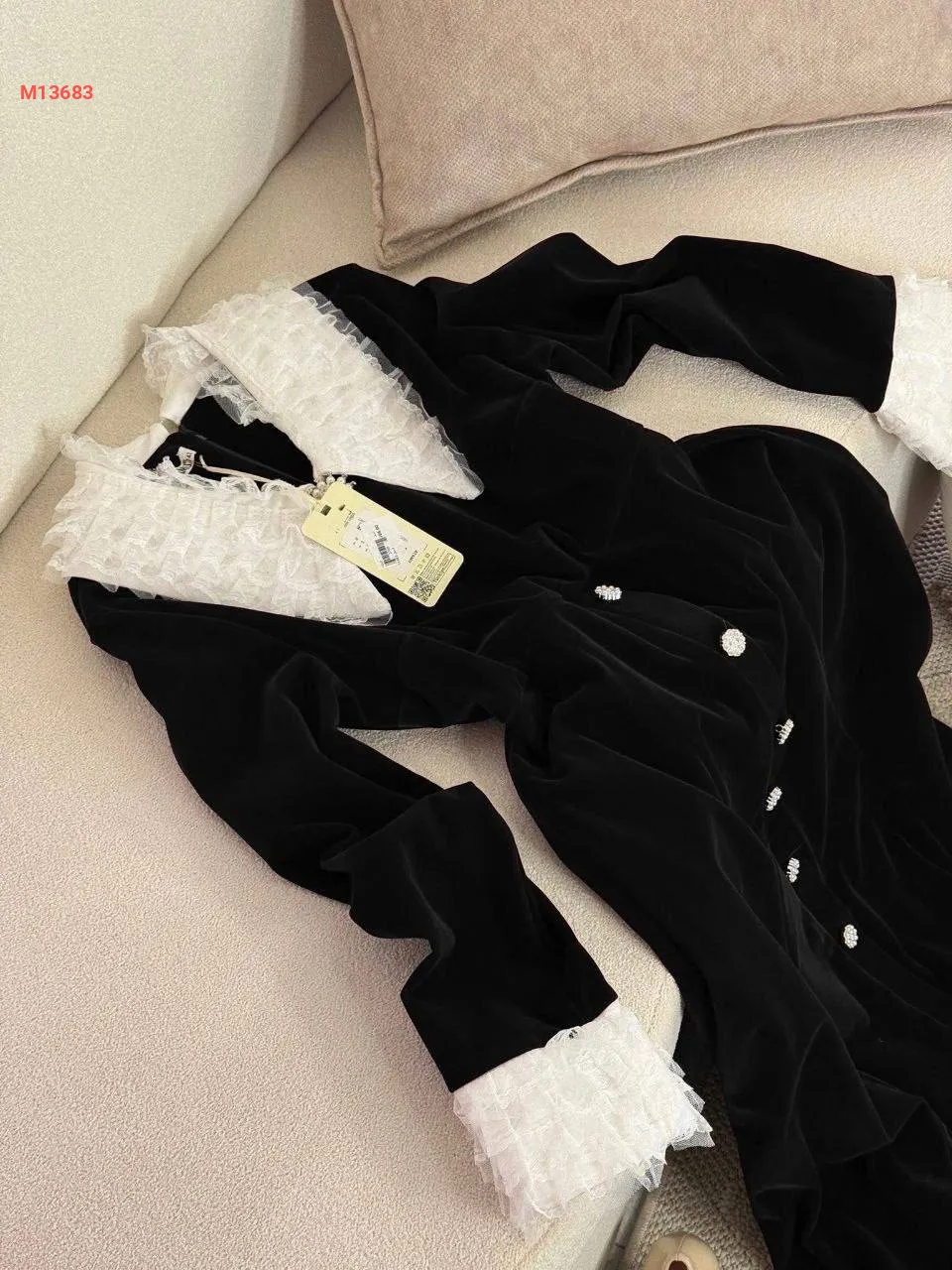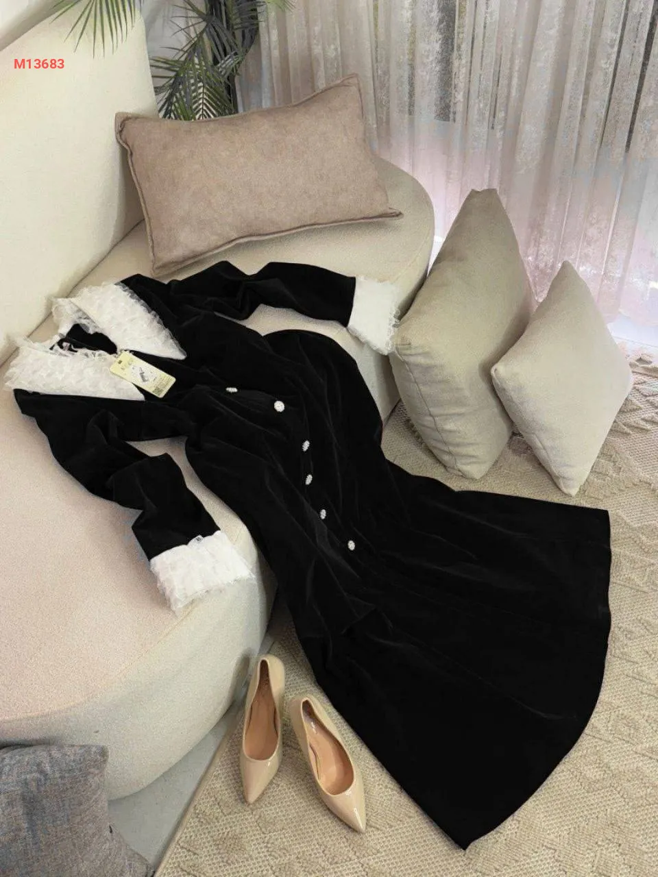 فستان مخمل سادة قبة دانتيل مع أكمام دانتيل،بأزرار