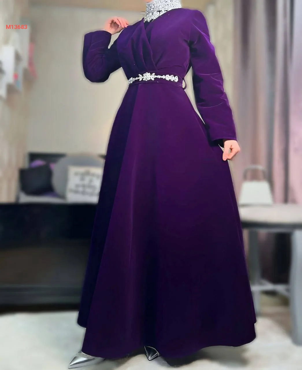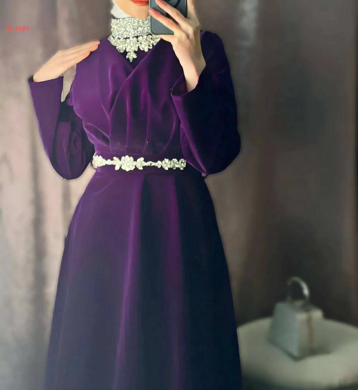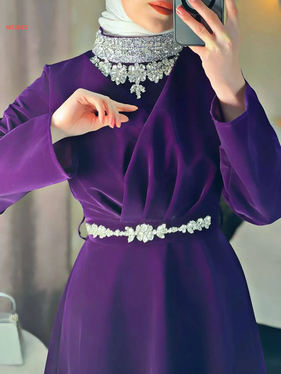 فستان مخمل ياقة مدورة مرصعة بالكريستال مع حزام مرصع بالكريستال