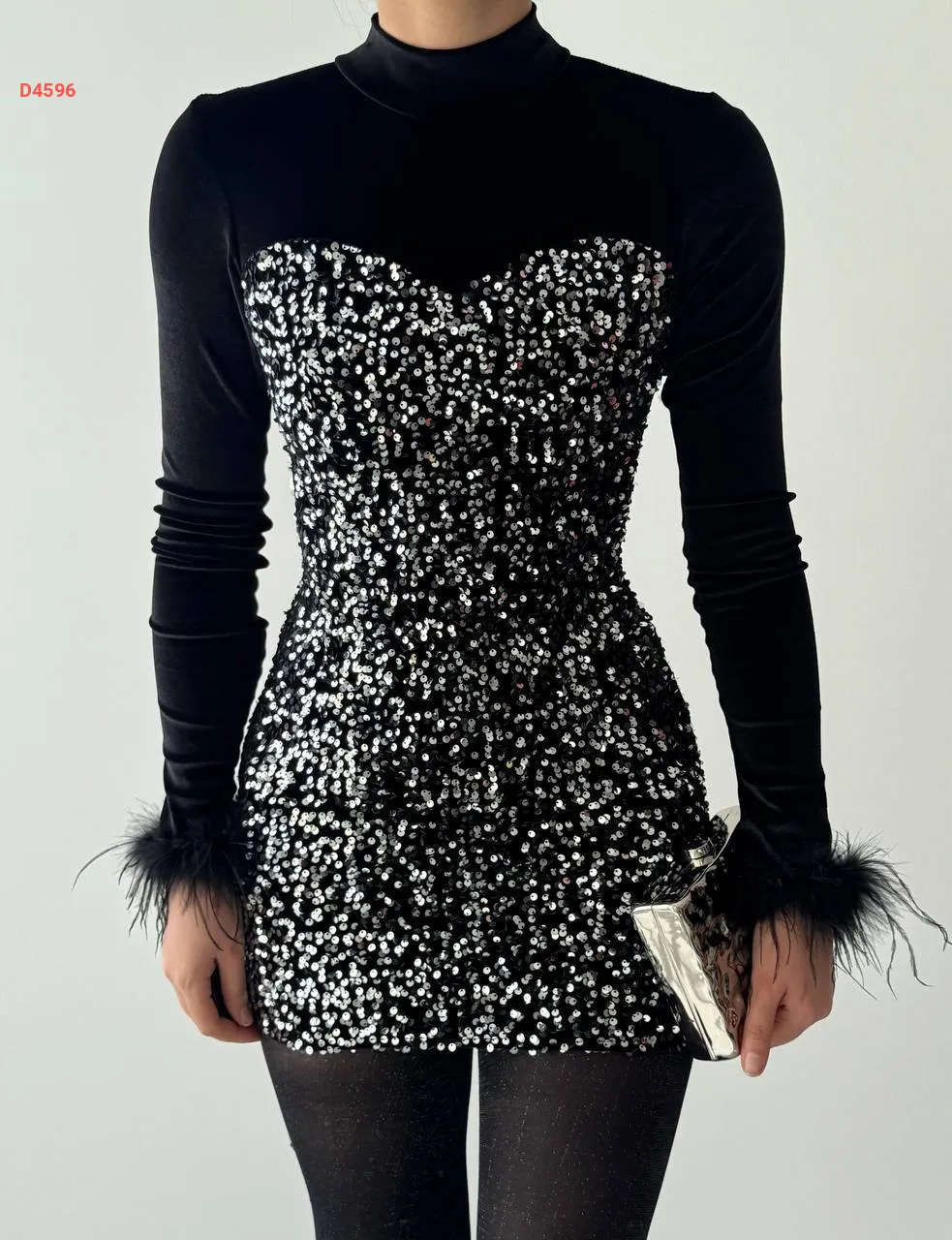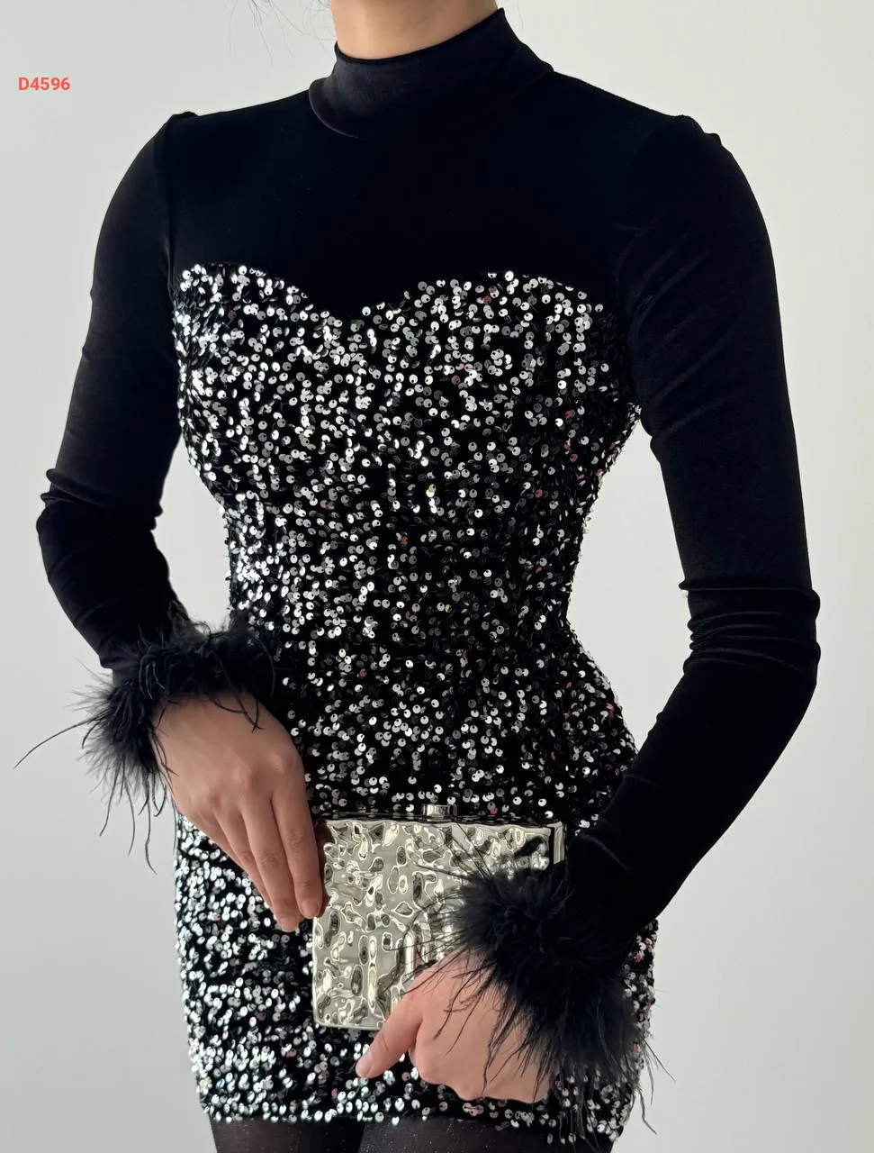 فستان مخمل مطرز بالترتر مع ريش عالكم