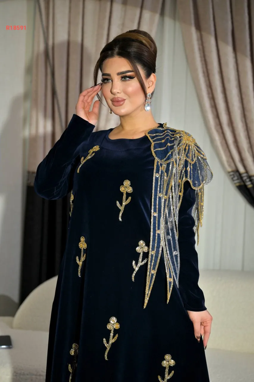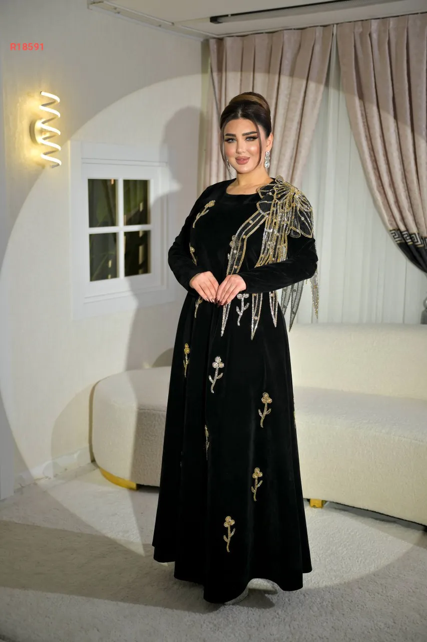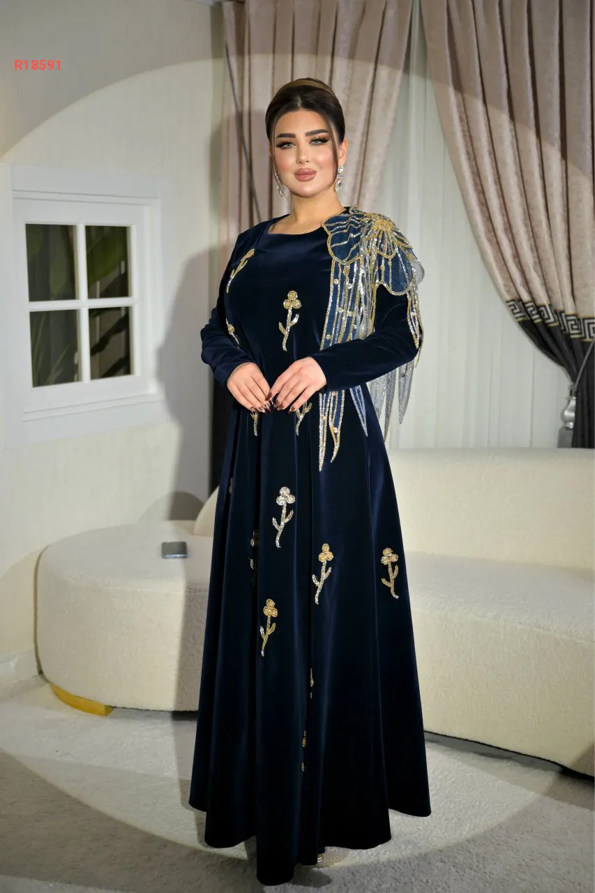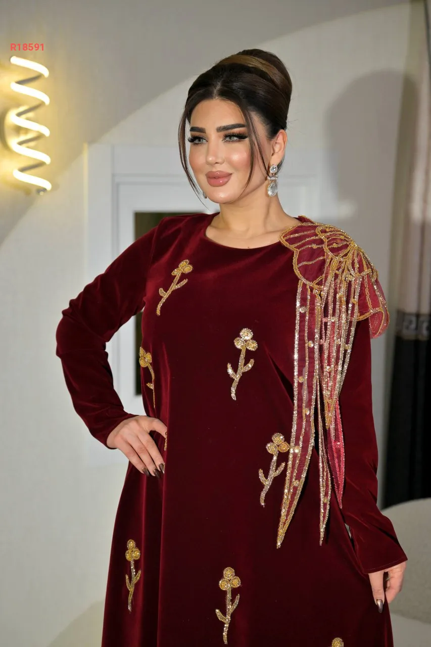 فستان سواريه مخمل، مع تطريز فاخر بالورود الذهبية ، بعرق شيفون شك برق عند الكتف