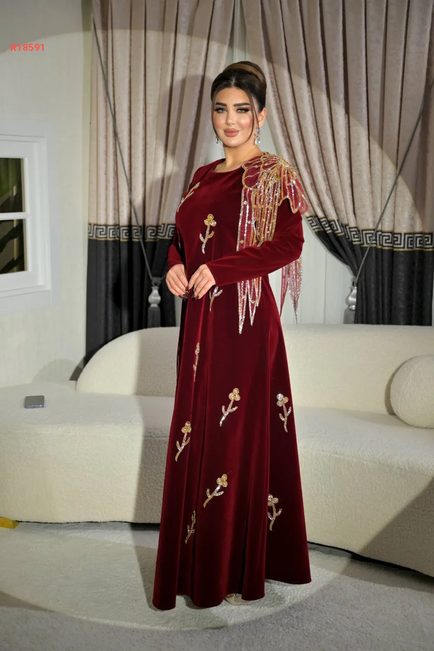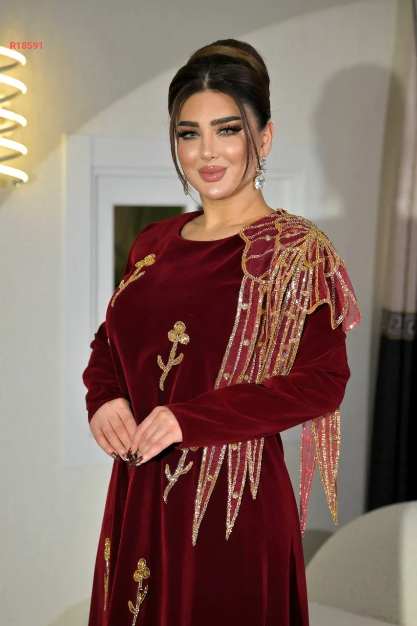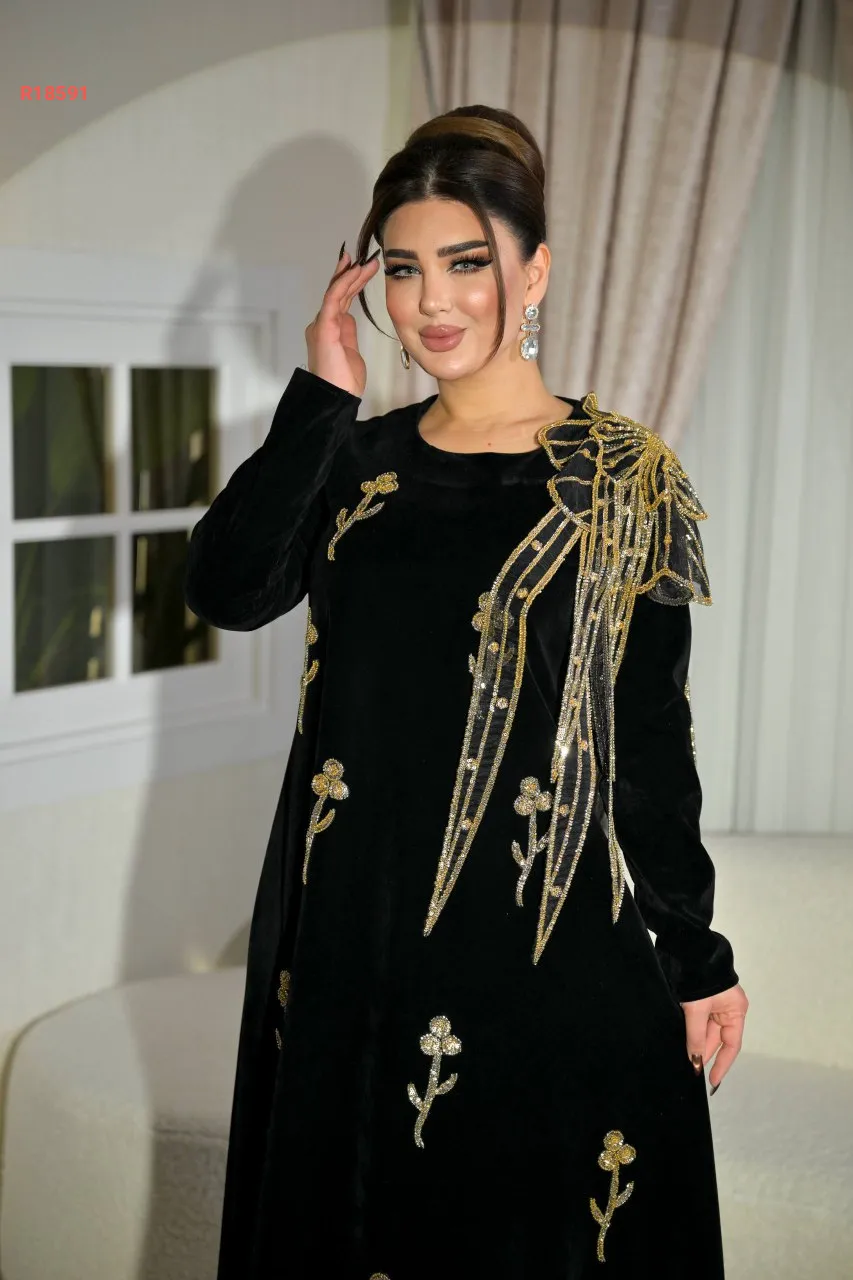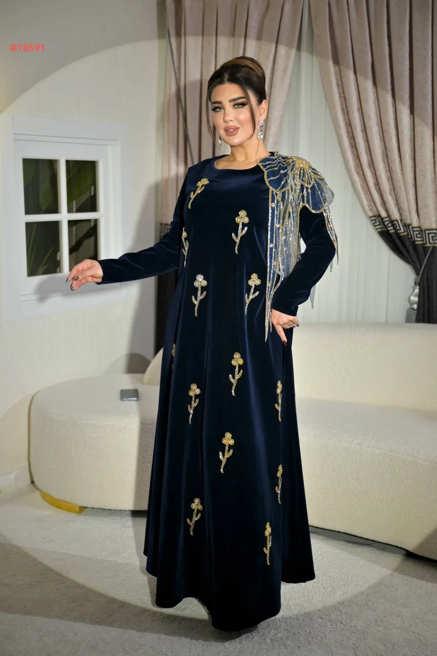 فستان سواريه مخمل، مع تطريز فاخر بالورود الذهبية ، بعرق شيفون شك برق عند الكتف