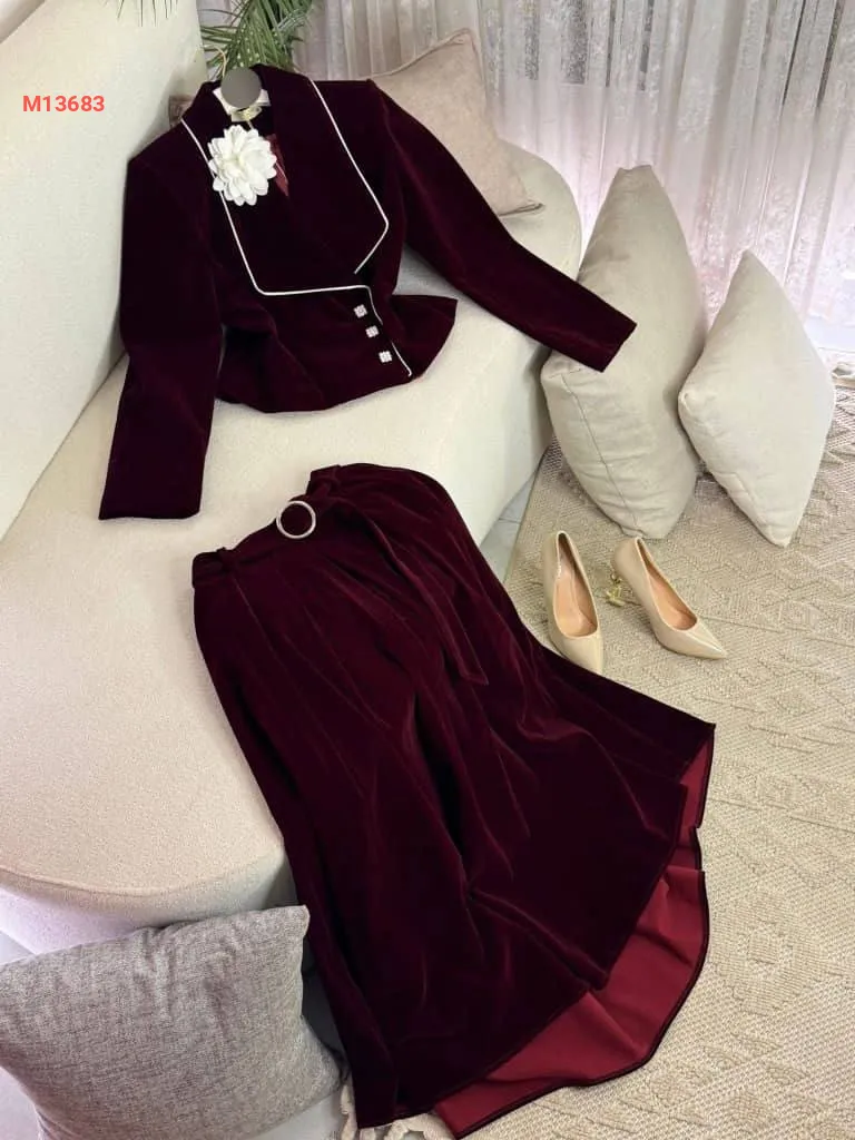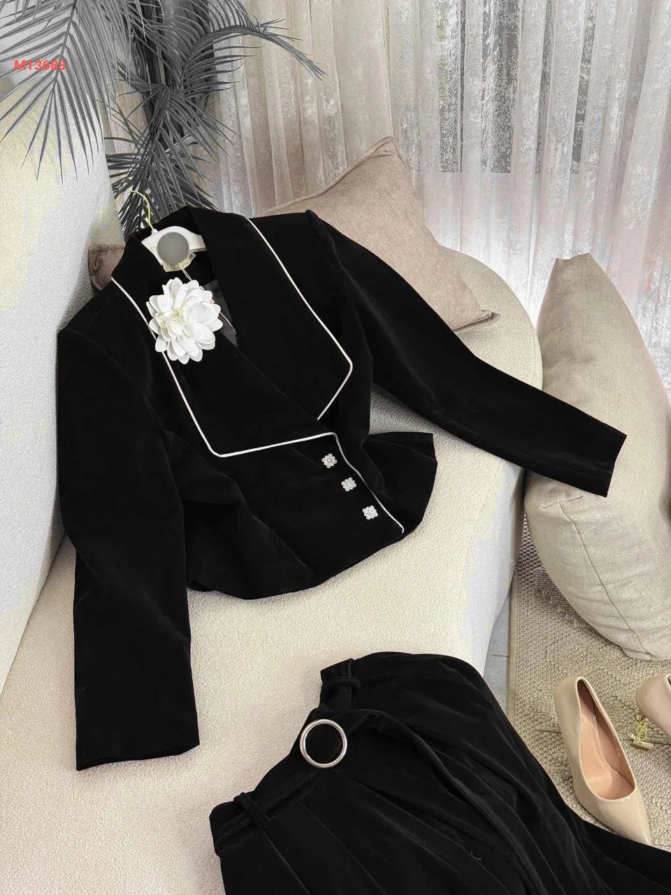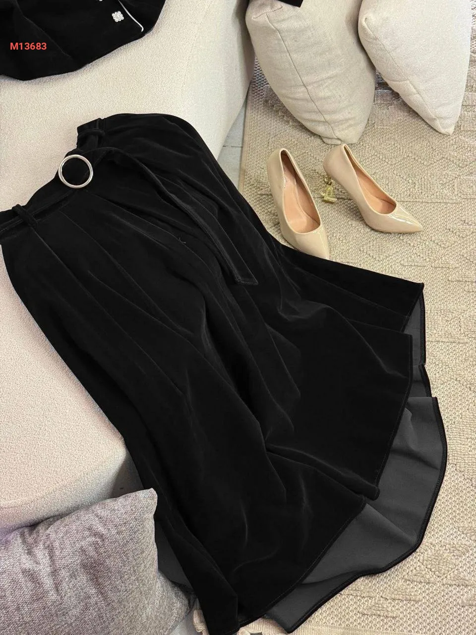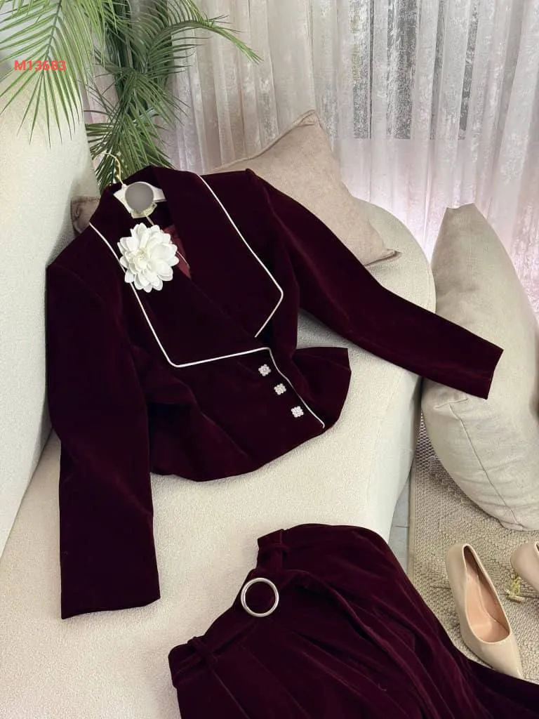 طقم تنورة مخمل بأزرار مع حزام عند الخصر