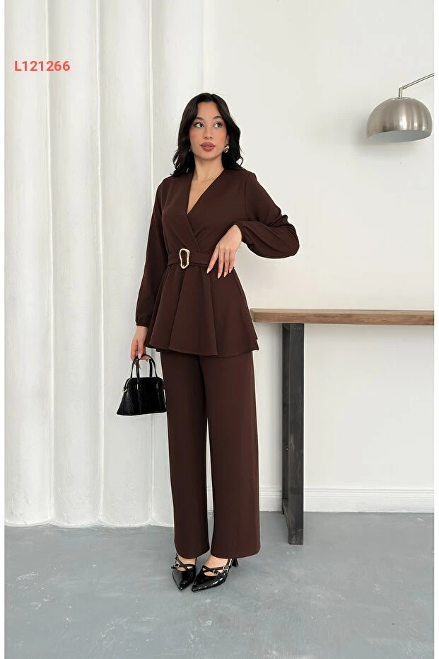 طقم علوى وسفلى بتفاصيل حزام وأكتاف منتفخة بياقة كروفاق من فيرابيلا