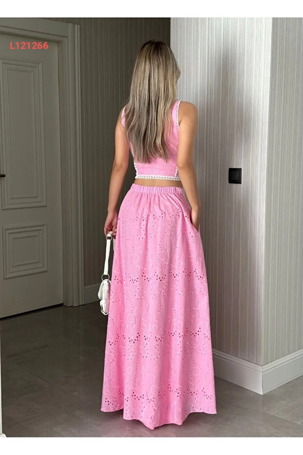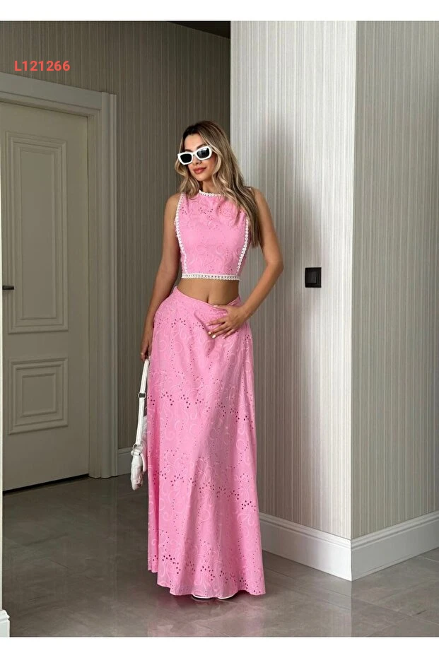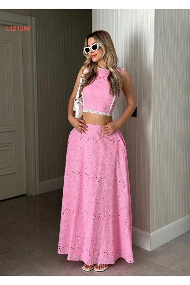استمتعي بأناقتك الصيفية مع طقم Viskosa Brode، الذي يتكون من بلوزة قصيرة عصرية وتنورة ماكسي عالية الخصر. يتميز القماش المريح والتصميم الأنيق بألوانه الزاهية، مما يجعله الخيار المثالي لإطلالة أنثوية رائعة تناسب كافة المناسبات. ارتدي هذا الطقم وكوني نجمة كل حفلة أو نزهة!