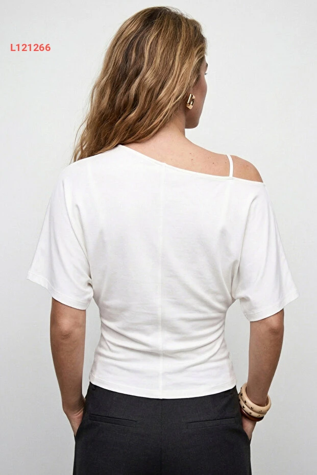 بلوزة فودنس بيضاء بستايل غير متساوي مع أكمام باترون الوارثة - 97% قطن