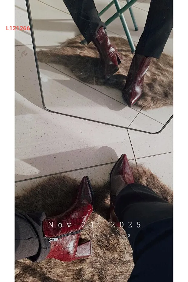 اكتشفي الأناقة والراحة مع بوت "v.s.h" الجديد المصنوع من جلد الكروكو الفاخر. تصميمه الكلاسيكي مع مقدمة مدببة وكعب سميك يمنحك إطلالة متميزة، بينما تسهل السوستة الجانبية ارتدائه بشكل سلس. مثالي لكل المناسبات، حيث يجمع بين الراحة والأناقة في خطوة واحدة!