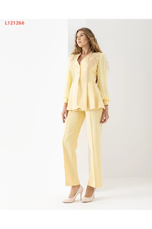 استمتع بأناقة لا تضاهى مع بدلة VUNTAL المكونة من جاكيت مزين بالتطريز الرقيق وتنورة ذات كسرات أنثوية، حيث تجمع بين الفخامة والراحة في تصميم واحد. مثالية للمناسبات الخاصة أو للعمل، تمنحك هذه البدلة لمسة من الجمال الكلاسيكي لتتألقي بثقة وأناقة في كل لحظة.