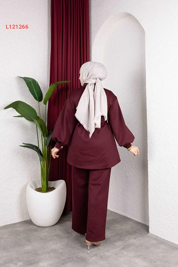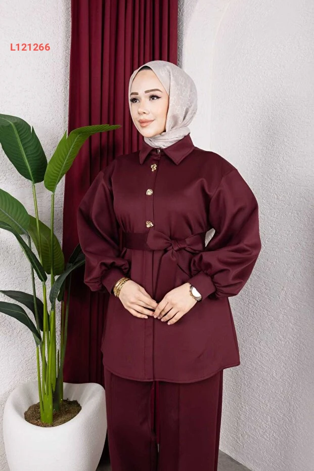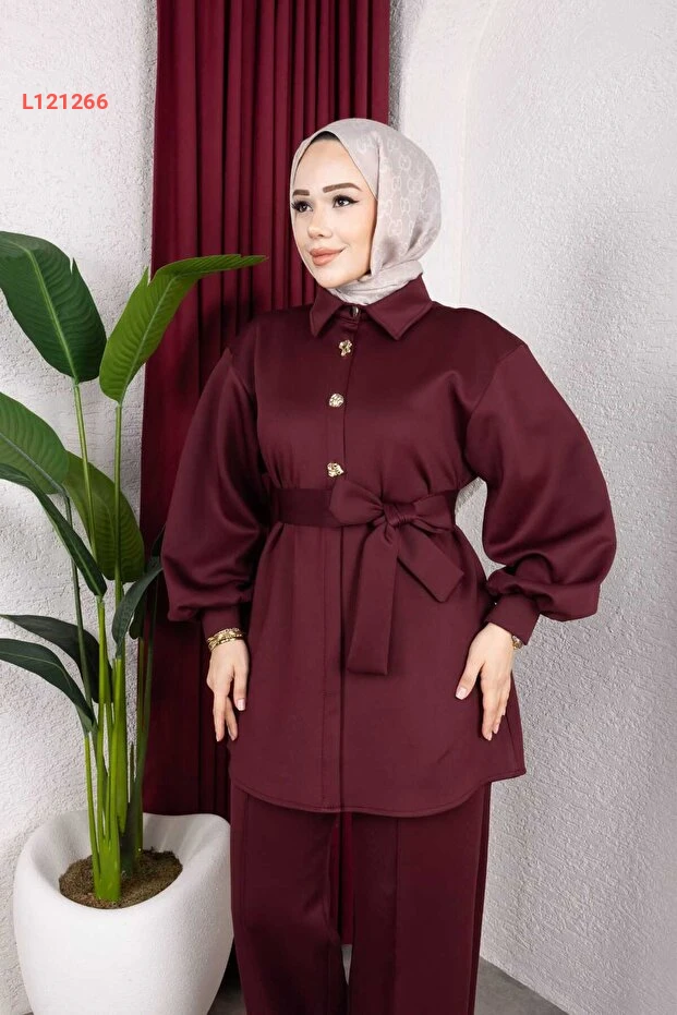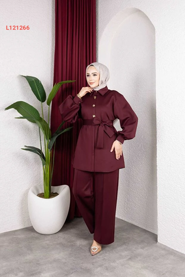 طقم تونيك وبنطال أنيق بالأزرار والأكمام الطويلة مع حزام