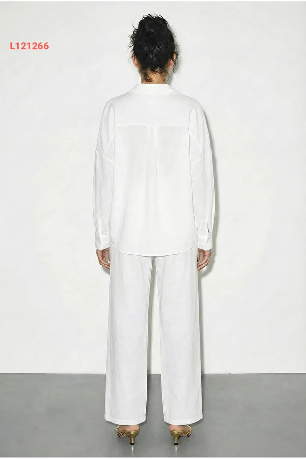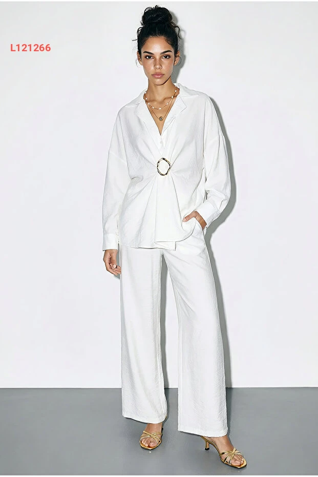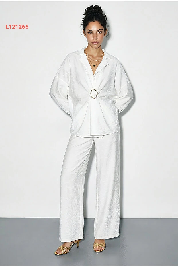 استمتعي بإطلالة عصرية ومريحة مع طقم Bianco Lucci المكون من قميص واسع وبنطلون واسع الساق. يتميز القميص المزود بإكسسواراته بتفاصيل أنيقة تناسب كل المناسبات، بينما يوفر البنطلون راحة استثنائية وحركة مرنة. احصلي على أسلوب يجمع بين الأناقة والراحة في قطعة واحدة!
