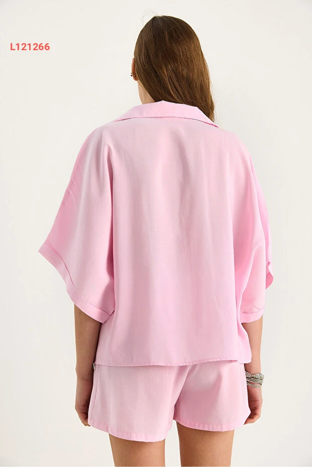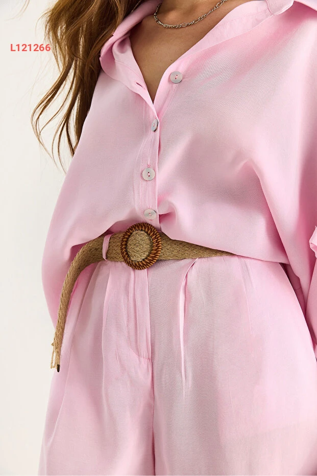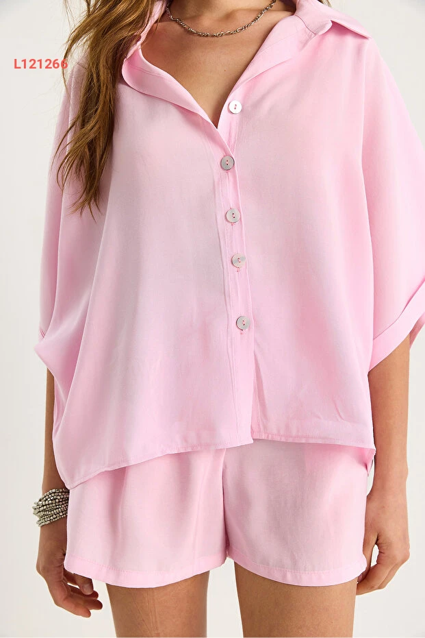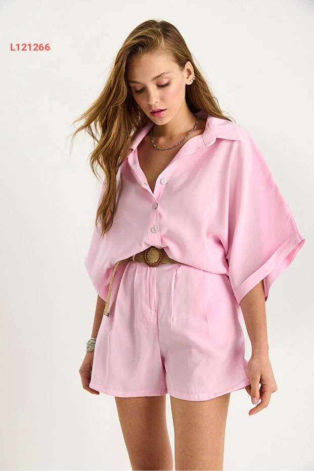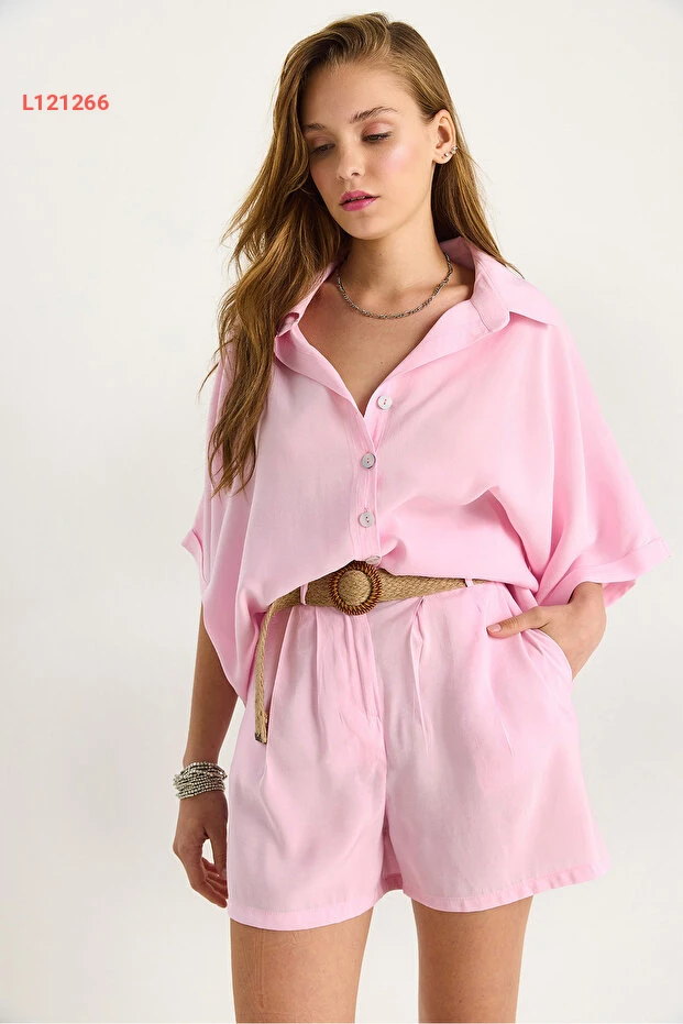 طقم نسائي مكون من قميص كبير بأكمام خفاش وشورت بحزام من القش - بيانو لوتشي