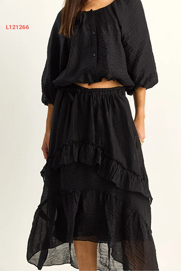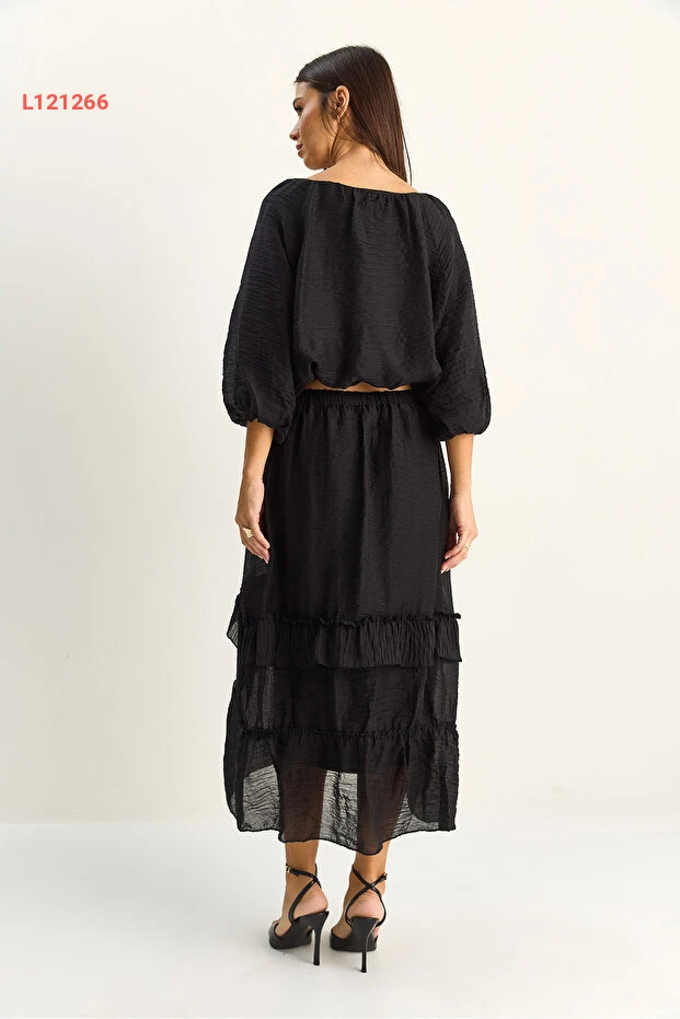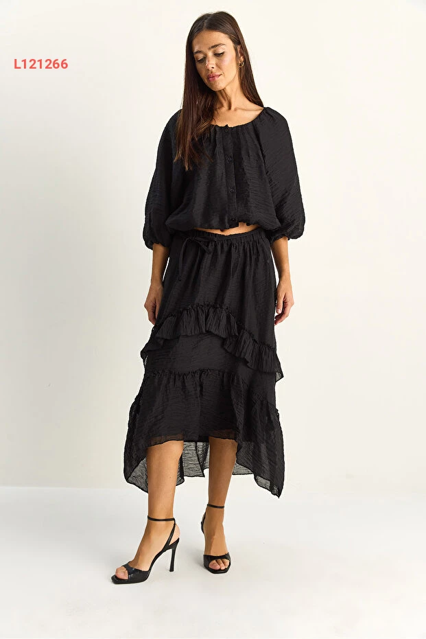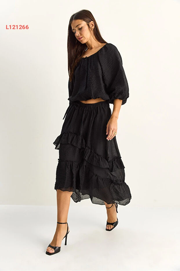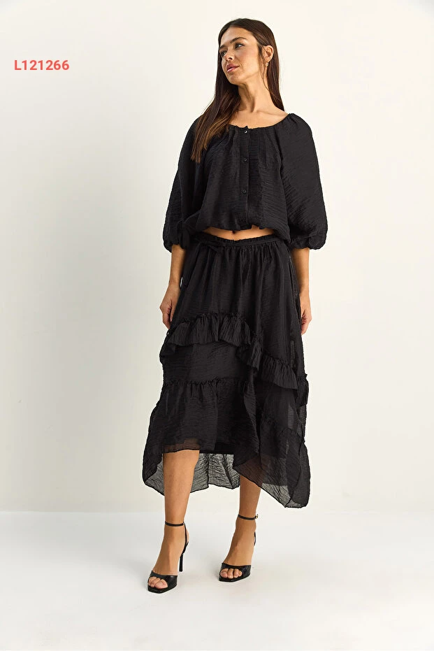 اكتشفي الأناقة والراحة مع طقم بلوزة كروشيه بياكو لوتشي، الذي يتميز بتصميمه الجذاب الذي يجمع بين الكشكش الأنيق وقصة الياقة المريحة. يأتي مع تنورة ماكسي بطبقات غير متساوية وأسطوانة داخلية، مما يضمن لكِ لمسة من الرقي مع حرية الحركة لكل مناسبة. ارتدي هذا الطقم لتتألقي بجاذبية لا مثيل لها!
