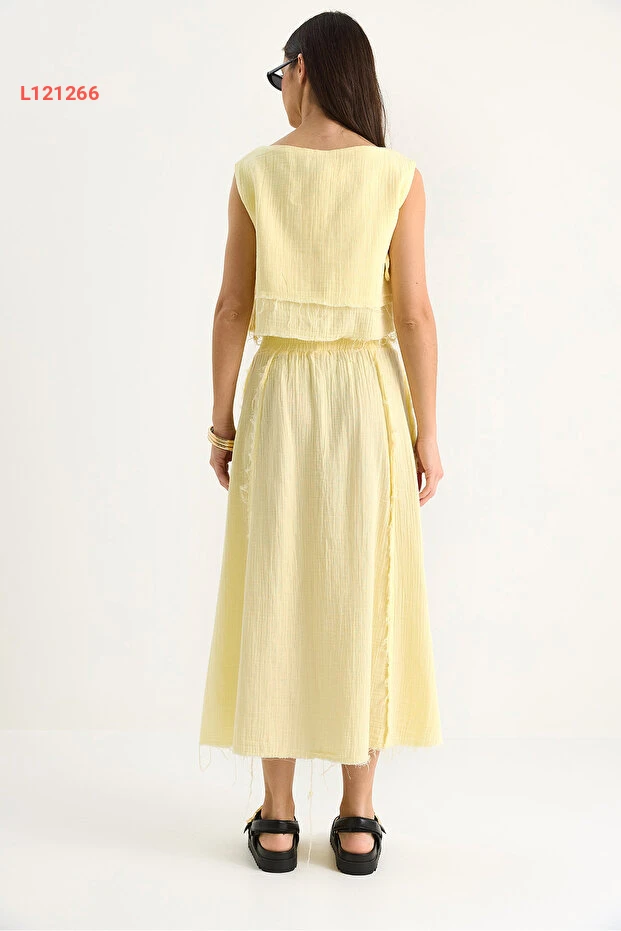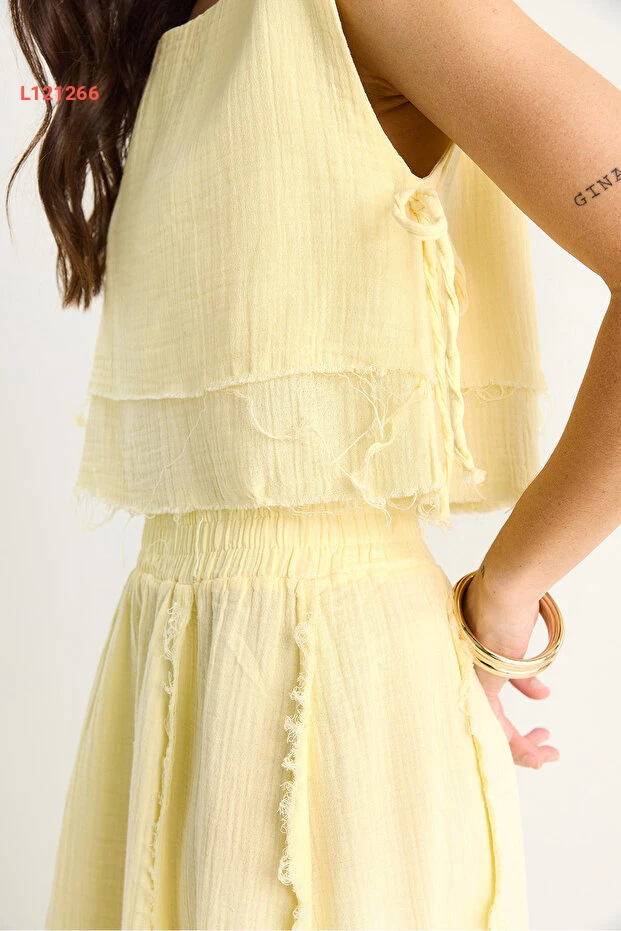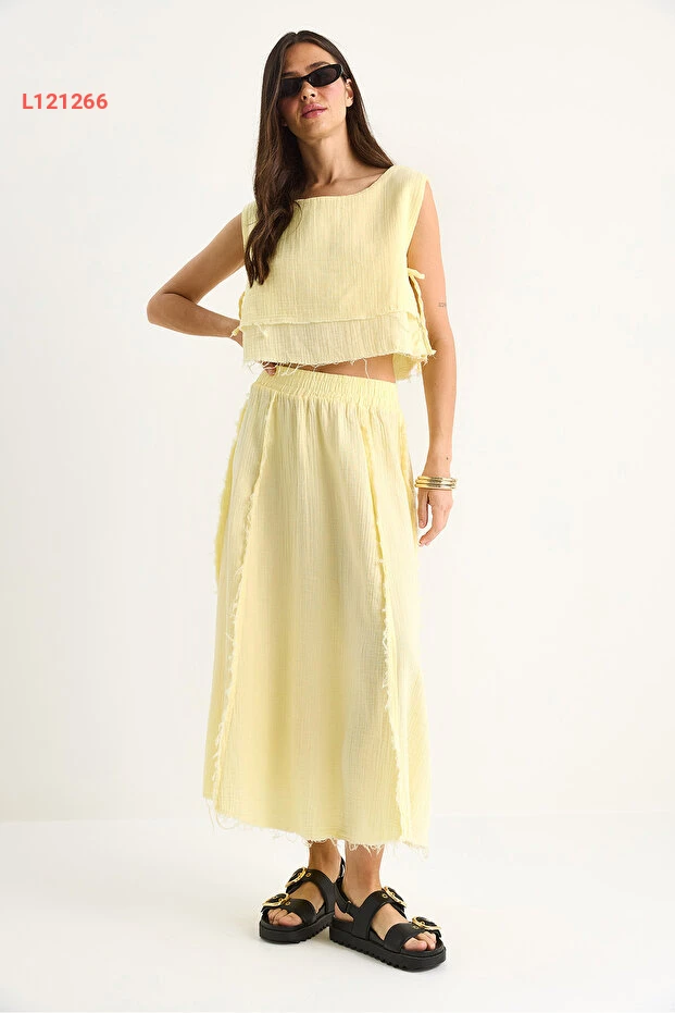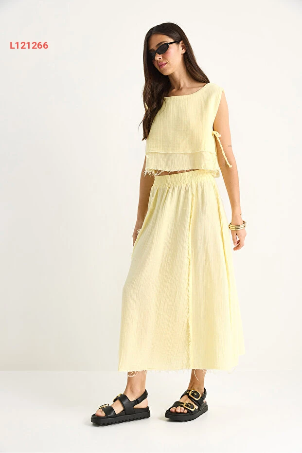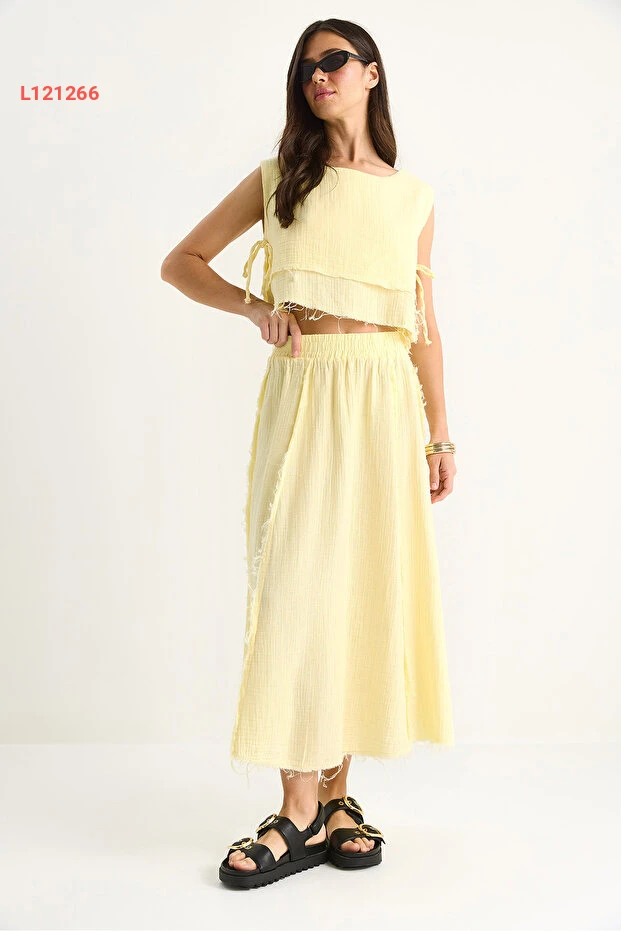 استمتعي بأناقة لا تُضاهى مع مجموعة Bianco Lucci المكونة من تنورة بخصر مطاطي وقصة عصرية. تتميز هذه المجموعة برباط جانبي يضيف لمسة فريدة إلى إطلالتك، بينما يوفر قماش الموسلين الخفيف الراحة اللازمة لكل مناسبة. ارتديها لتكوني محط الأنظار في كل مناسبة!