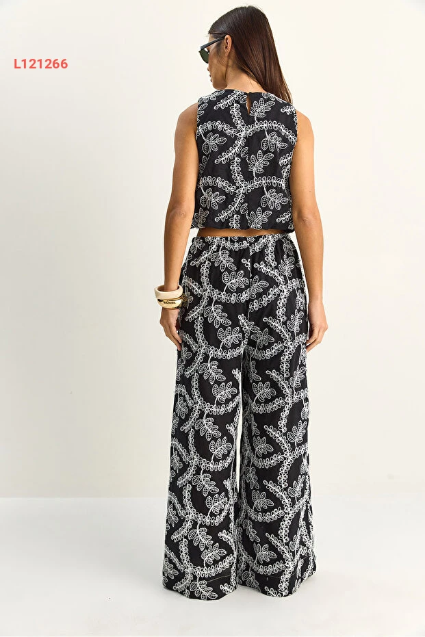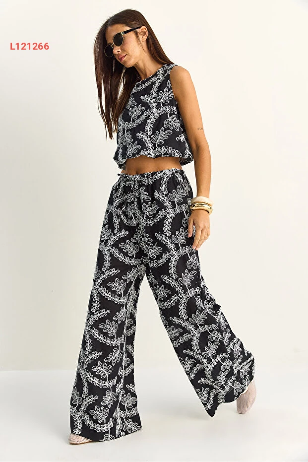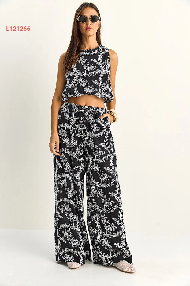 استمتعي بإطلالة أنيقة وعصرية مع طقم Bianco Lucci المكون من بلوزة ذات قصّة كروب مزينة بتطريزات أنيقة وبنطلون واسع بطوق مريح. يجمع هذا الطقم بين الراحة والفخامة، مما يجعله مثالياً لمختلف المناسبات. ارتدي هذا التصميم الرائع لتظهري بأفضل إطلالة وتلفتي الأنظار بكل أناقة!