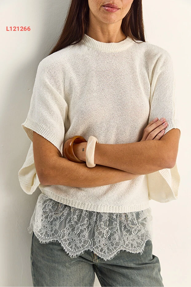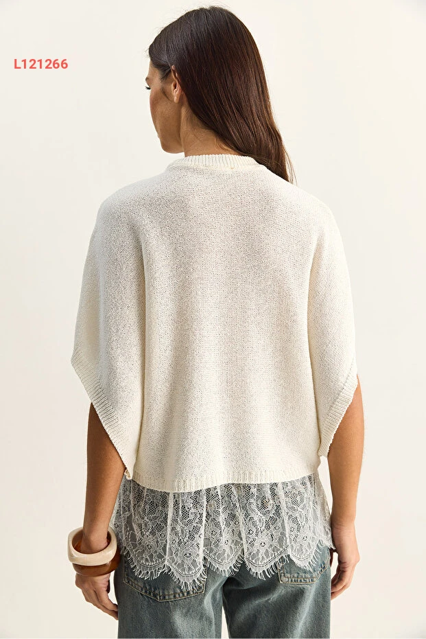 بلوزة نسائية بتفاصيل دانتيل بياكو لوتشي، ياقة نصف عالية وأكمام واسعة
