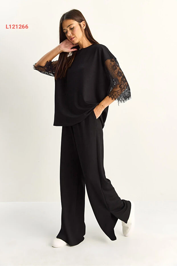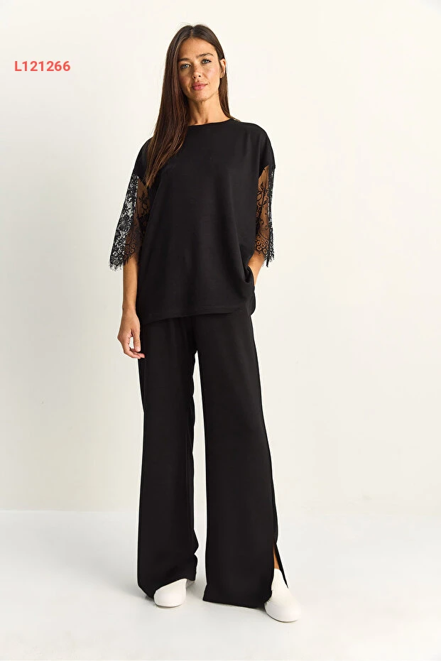 استمتعي بالأناقة والراحة مع طقم Bianco Lucci المذهل، الذي يتضمن ت-shirt بأكمام دانتيل بلمسة عصرية وبنطلون واسع بخصر مرن. تصميم oversize يضمن لك حرية الحركة، بينما يضيف الدانتيل لمسة من الأنوثة والرقي، مما يجعله مثاليًا لمختلف المناسبات. اجعلي كل يوم خاصًا مع هذا الطقم الأنيق!