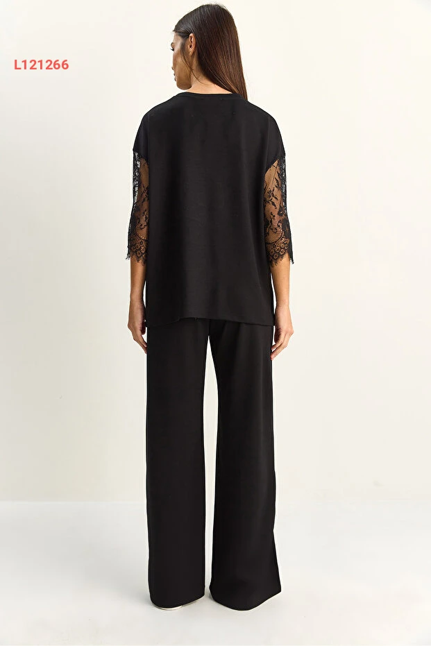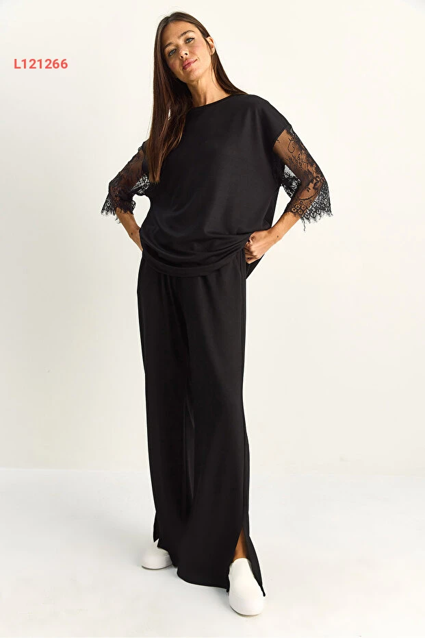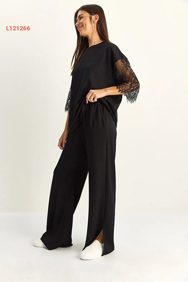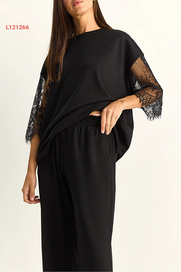 طقم بيانو لوتشي النسائي: تي شيرت أساسي بأكمام دانتيل وسروال فضفاض بخصر مرن 4115 60286085