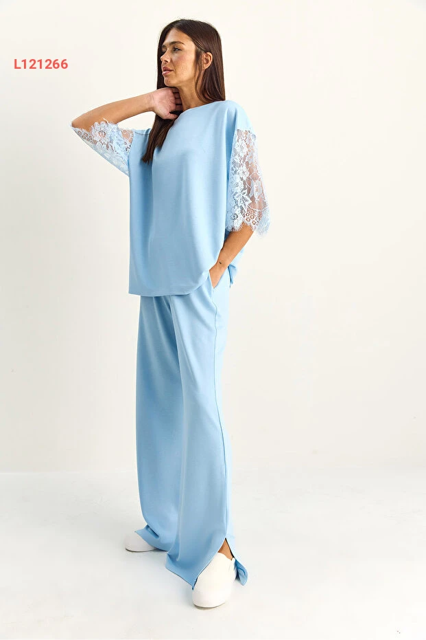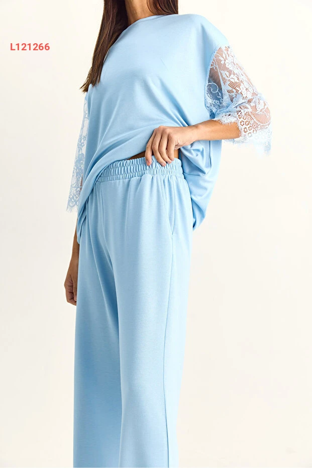 طقم بلوزة أساسية بأكمام دانتيل وسروال فضفاض مطاطي من بيانكو لوتشي للنساء