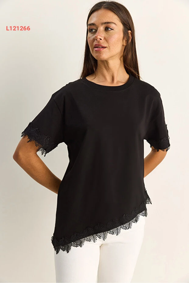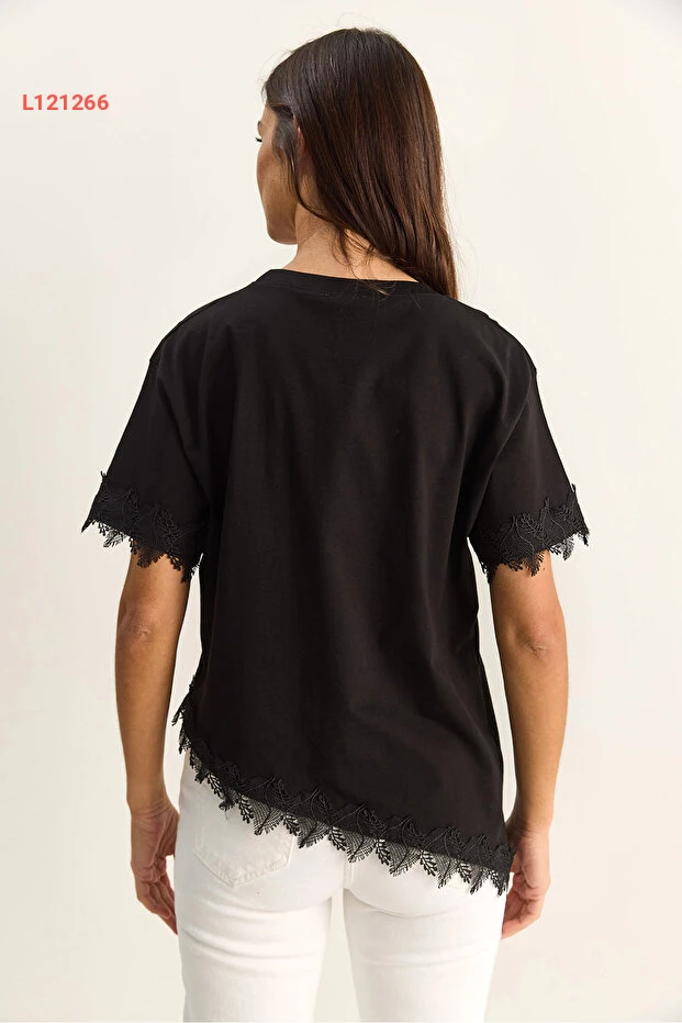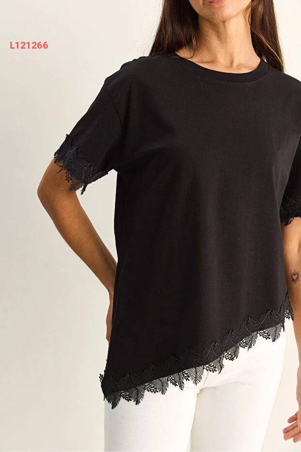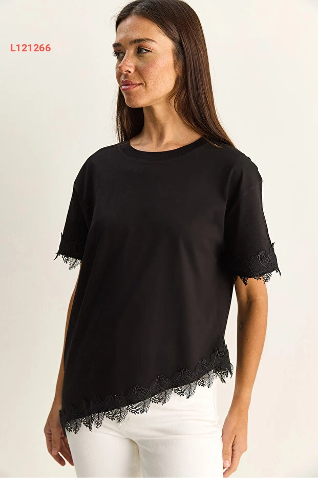 تي شيرت نسائي أزرق بيكو لوتشي بتفاصيل دانتيل وقصة غير متماثلة