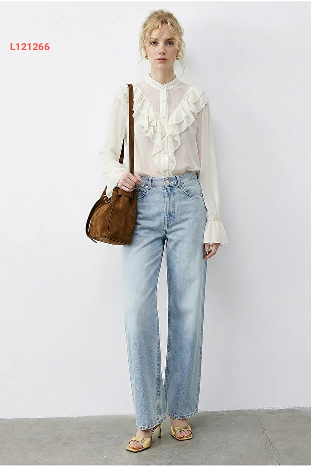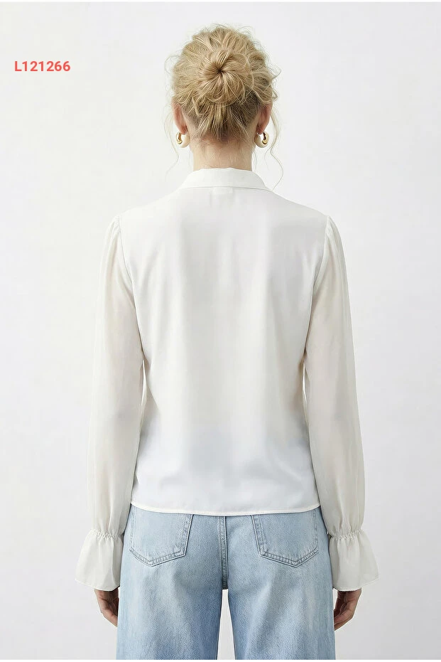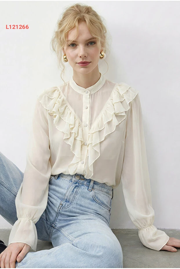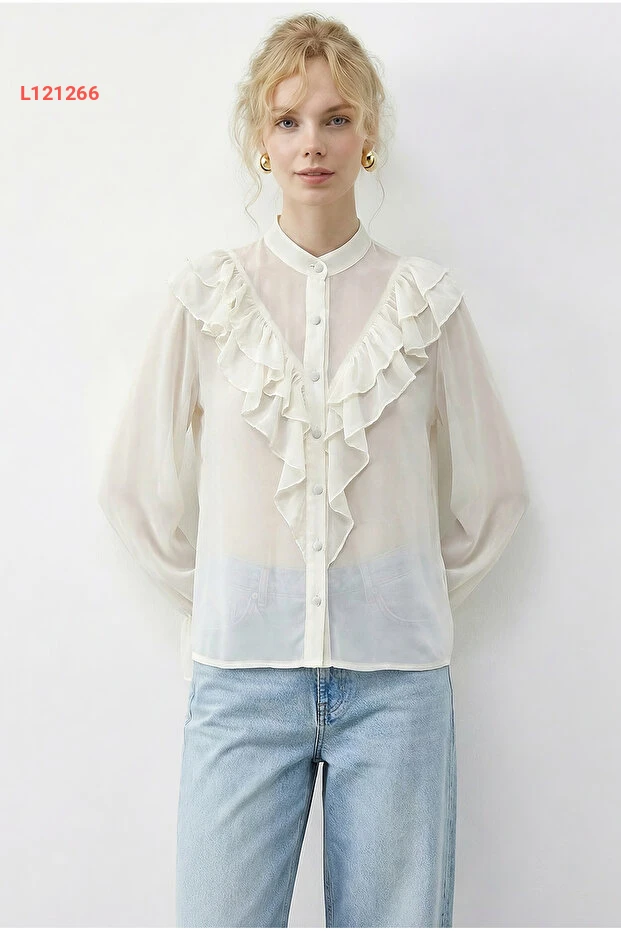 استمتعي بأناقتك مع بلوزة Bianco Lucci الأنيقة، المصممة من الشيفون الشفاف ذو التفاصيل الرائعة من الكشكش. تمنحك هذه البلوزة مظهرًا عصريًا وجذابًا، مما يجعلها مثالية للظهور في المناسبات اليومية أو المسائية. ارتديها مع البنطلونات أو التنانير للحصول على إطلالة متكاملة مليئة بالأنوثة.