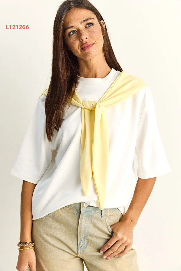 استمتع بمظهر أنيق ومريح مع تي شيرت Bianco Lucci النسائي بتفاصيل الشال. تصميمه الأوفر سايز يمنحك حرية الحركة، بينما تضيف التفاصيل الراقية لمسة من الجمال والتميّز. مثالي للاطلالات اليومية أو المناسبات غير الرسمية، هذا التي شيرت هو الخيار المثالي لكل امرأة تبحث عن الأناقة البسيطة.