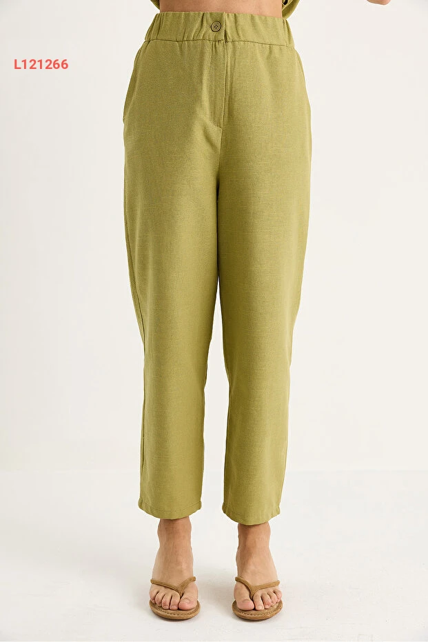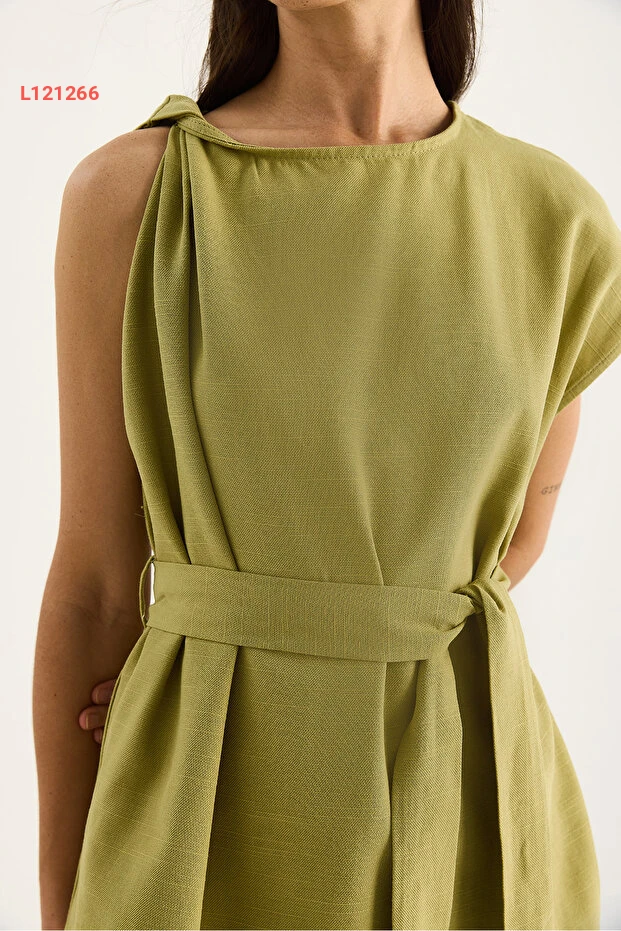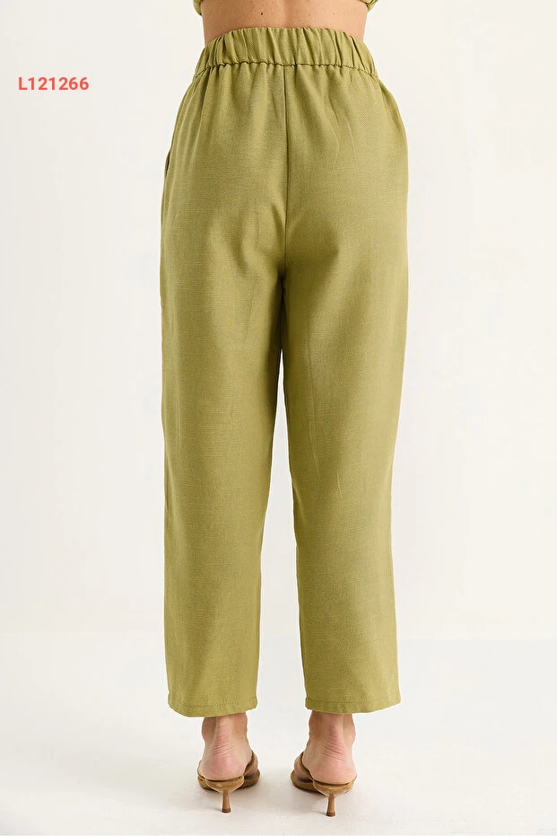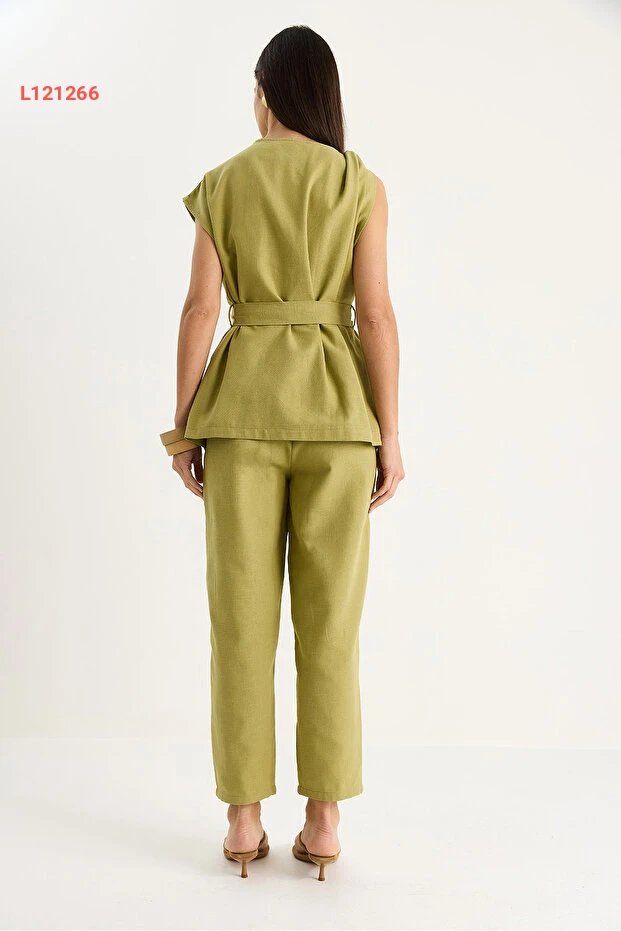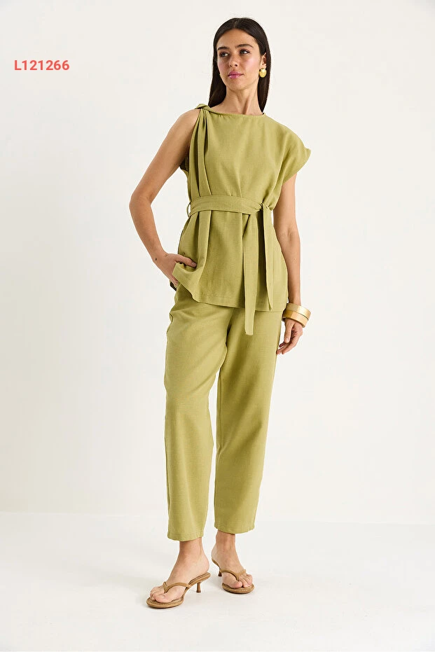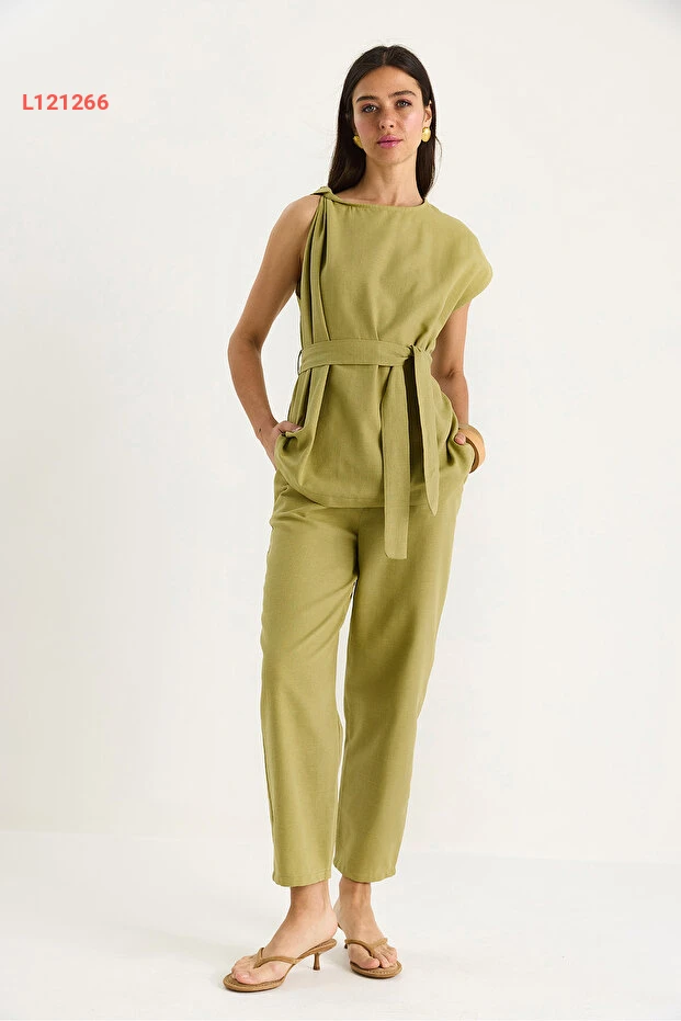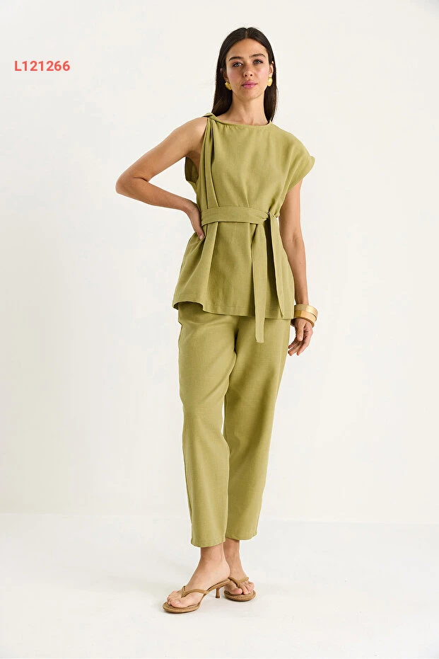 طقم كتان نسائي بلوزة وسروال بحزام وتفاصيل عقدة من بيانكو لوتشي