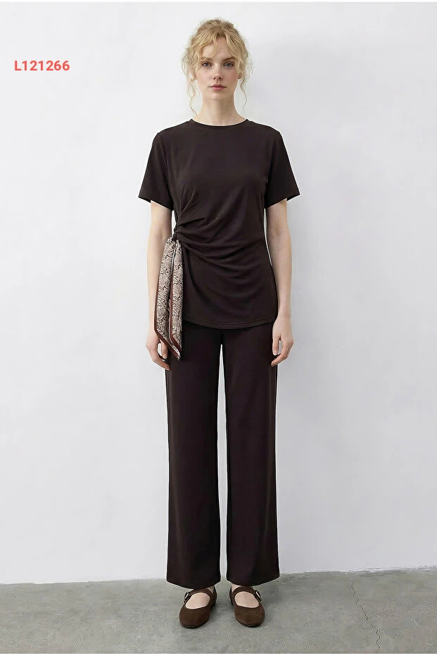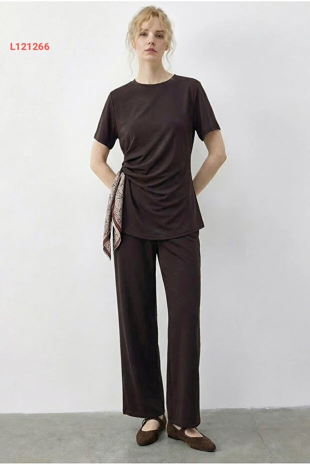 استمتعي بأناقة لا تضاهى مع طقم Bianco Lucci المكون من تي شيرت مزين بتفاصيل ربط جذابة وسروال بطاست عالي الخصر. يتميز هذا التصميم الفريد بنسيج مريح وأناقة عصرية، مما يجعله الخيار المثالي لكل المناسبات. ارتدي ثقتك وتألقك مع هذا الطقم الذي يعكس ذوقك المتميز.