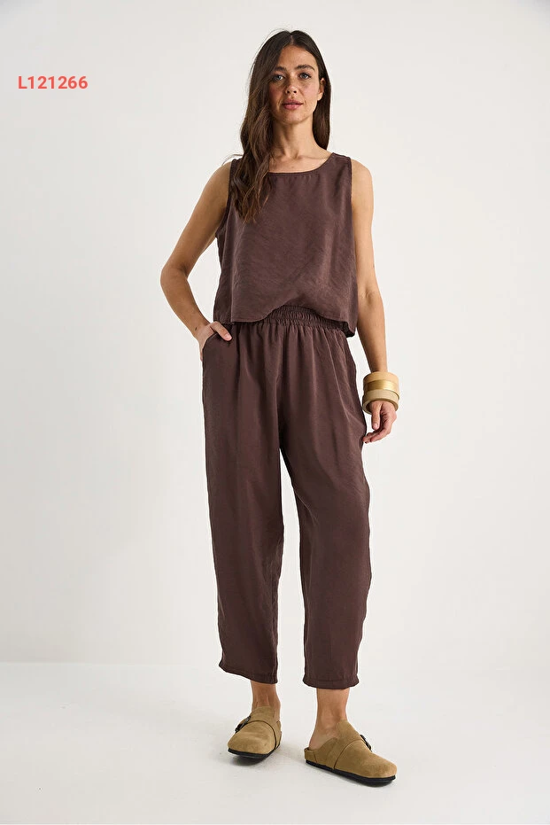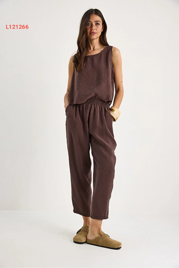 استمتعي بأناقة مريحة مع طقم Bianco Lucci المكون من بلوزة ذات حمالات سميكة وسروال بخصر مُرِن. يتميز هذا التصميم الجذاب من قماش المودال الناعم بملمسٍ مريح يسمح لكِ بالتنقل بحرية، بينما يضمن الخصر elastisiz شكلًا أنيقًا يدعم أنوثتك. أضفي لمسة من الأناقة العصرية إلى خزانة ملابسك مع هذا الطقم الفريد!