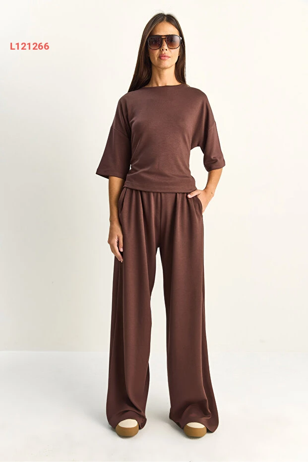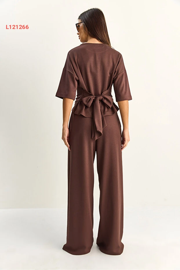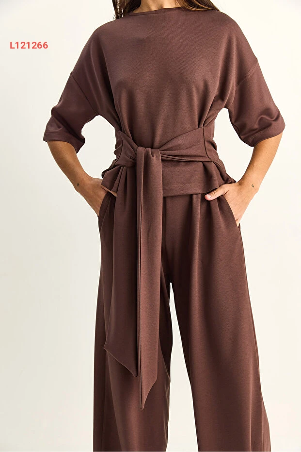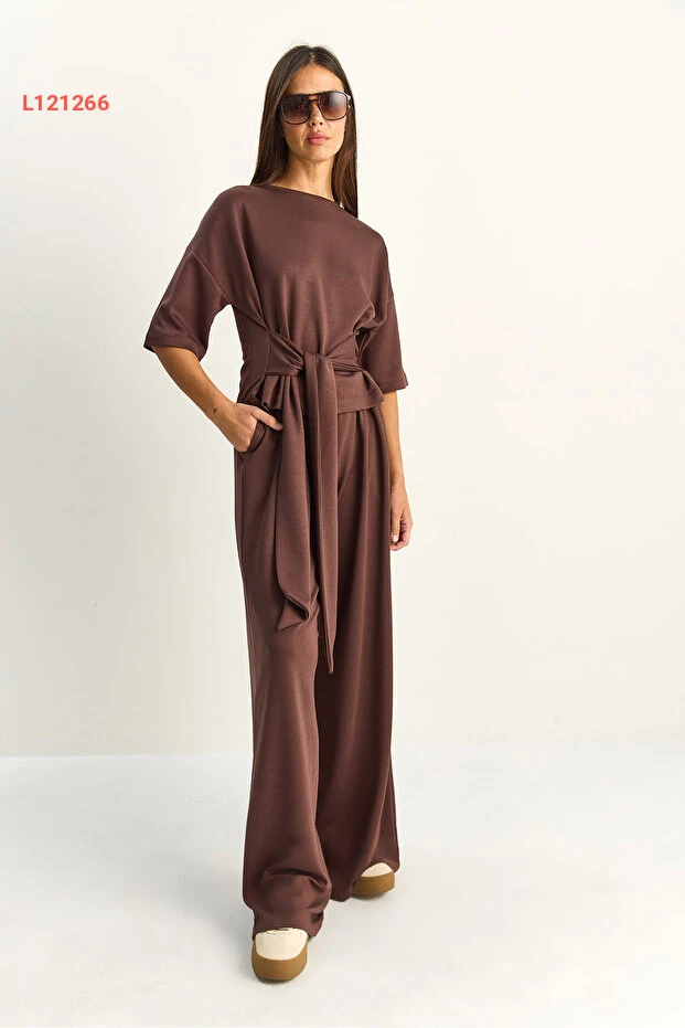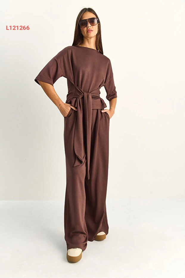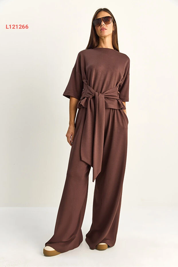 استمتعي بأناقة غير متكلفة مع مجموعة Bianco Lucci، التي تتضمن تيشيرت أساسي برباط عند الخصر وسروال واسع يمتاز بالراحة والتصميم العصري. مصنوعة من خامة المودال الناعمة، تمنحك هذه المجموعة شعورًا بالرفاهية وأناقة مثالية لكل المناسبات. احصلي على إطلالة مريحة وعصرية تُبرز أنوثتك بكل سهولة!