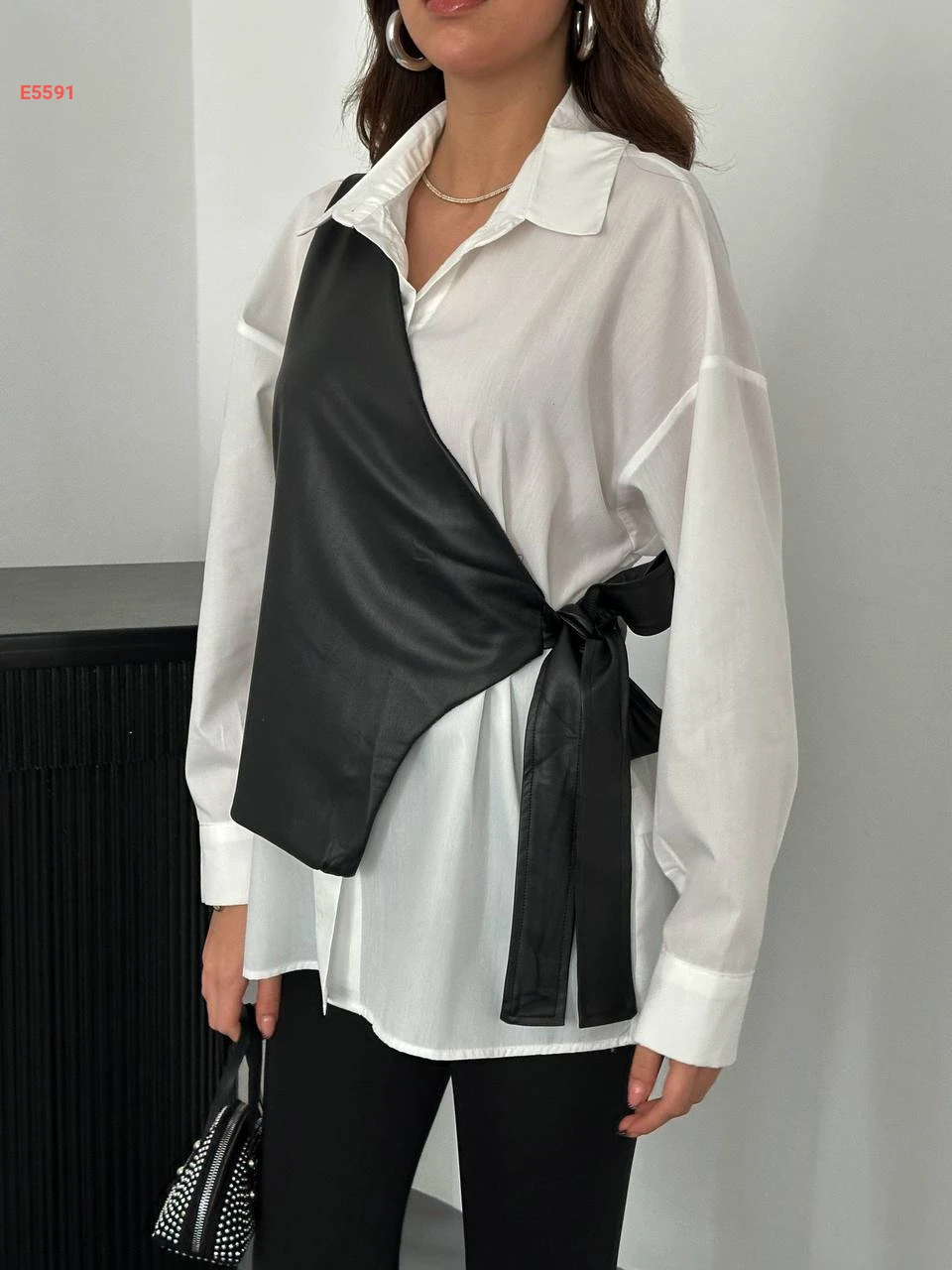قميص أبيض مع تفاصيل يلك جلد بربطة