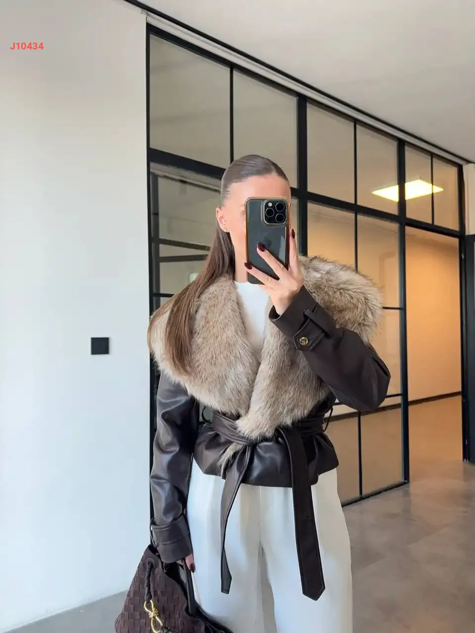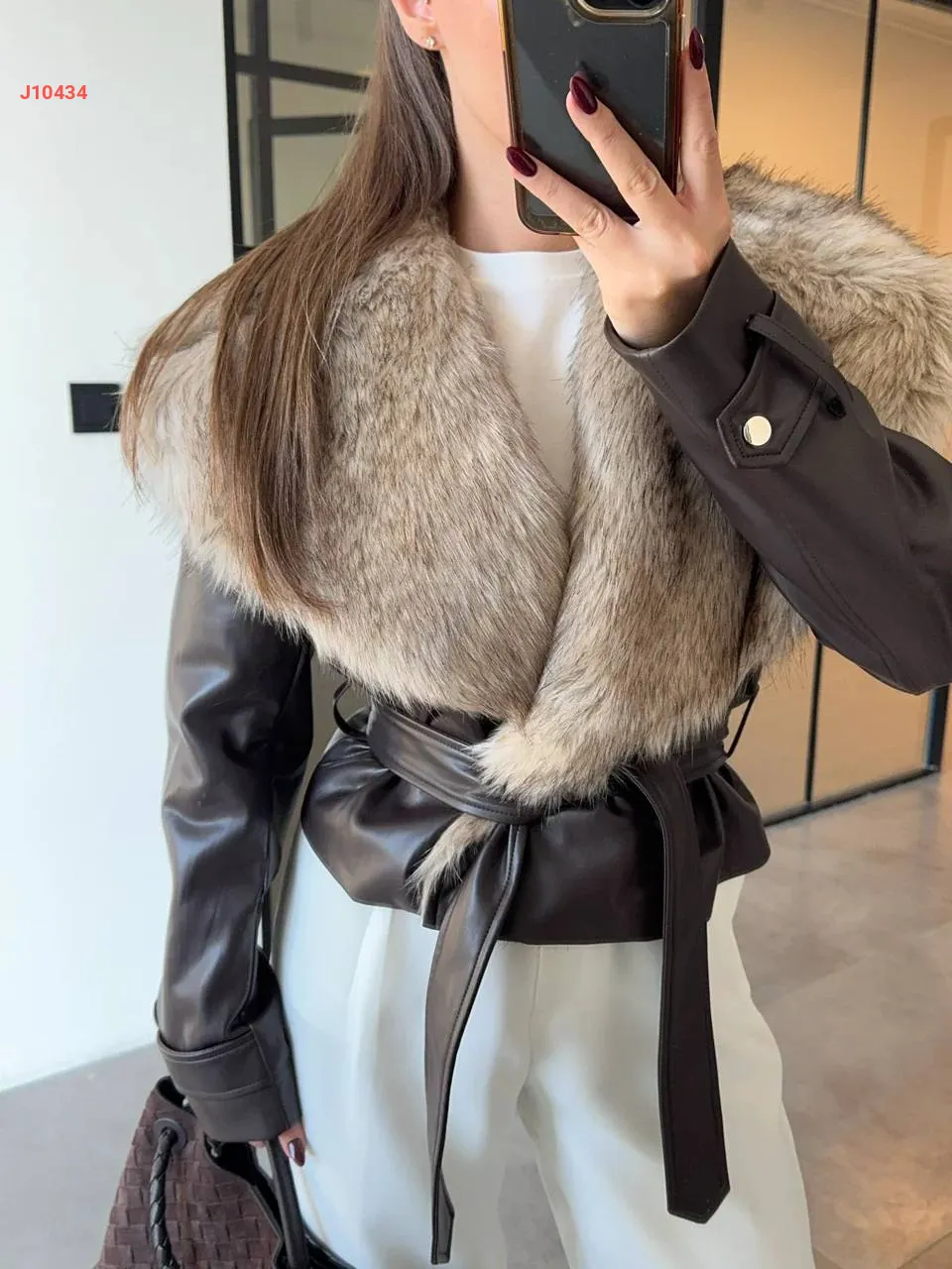 جاكيت جلد بياقة فرو واسعة
